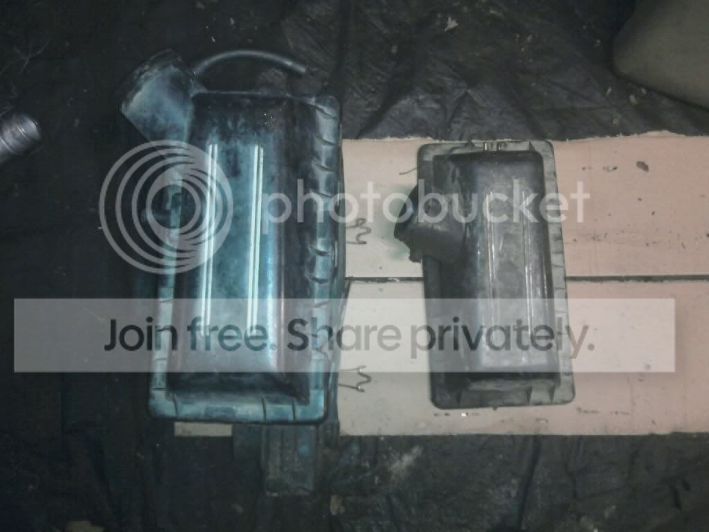 Cherokee air box ('84-90) with an additional '91-'95 top. Air box is cracked from the accident, side has an ~3" hole cut in it for a snorkel and front has a piece permatexed to it to close that hole. The snorkel hole is before the filter so the box can still be used.