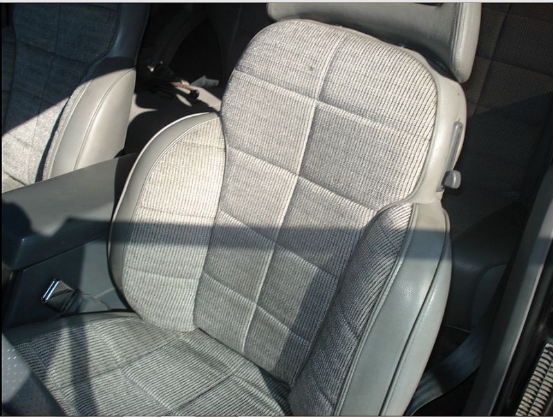 Just for chits and giggles, here's some pics of the botched passenger seat. Note the cream instead of grey vinyl, the color of the fabric (blue grey with red flecks), no stitching, and the overall construction. The drivers side is just as bad.