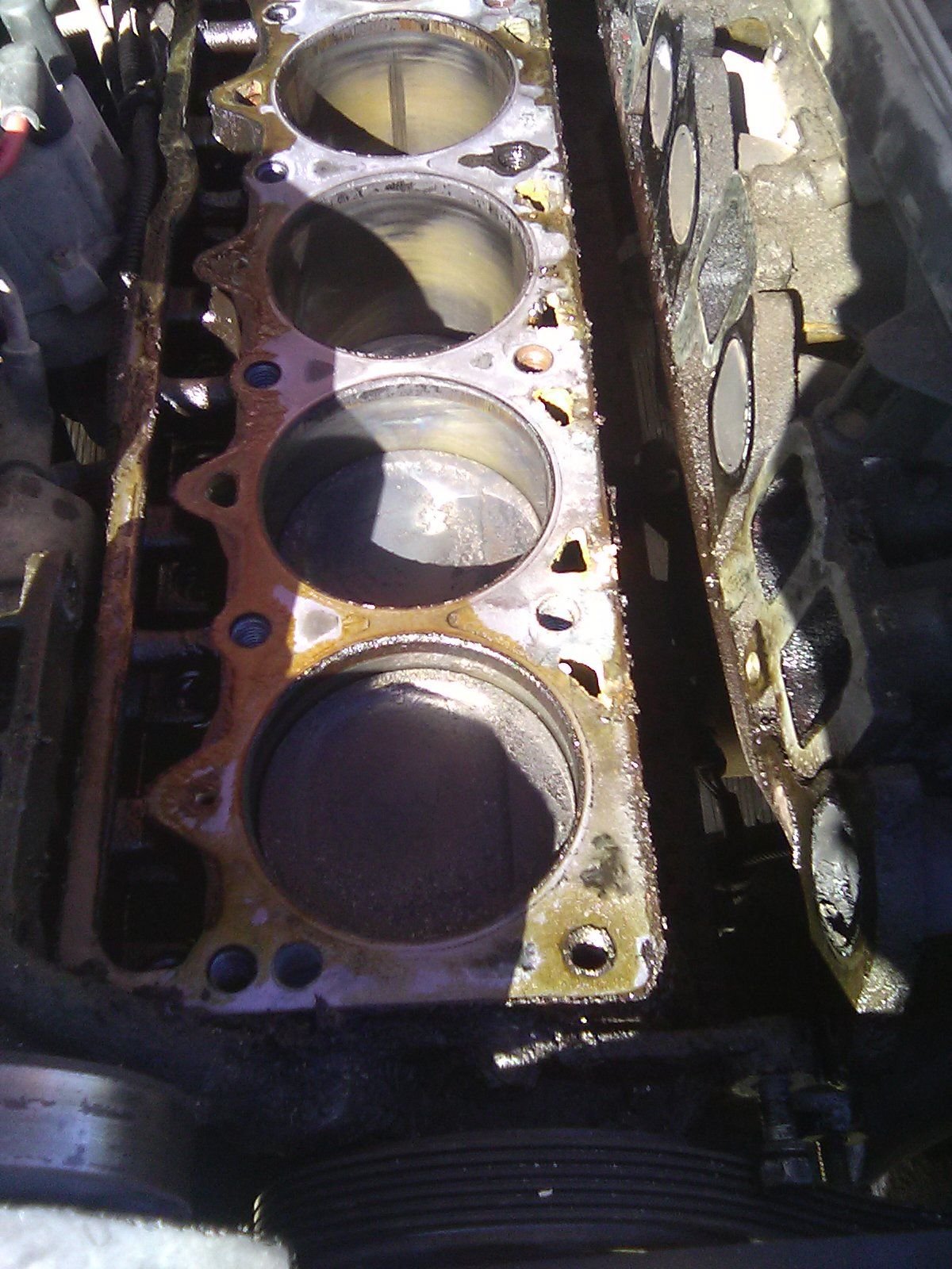 First off I decided to replace the thermostat, which I did along with the sensor in the thermostat housing. But funny thing is, when I removed the housing I found the thermostat was missing! To make a long story short, I found the vehicle would idle for 30 minutes or more and not overheat, but after a 15 minute drive the coolant temperature passed the midway mark again and almost hit the red zone before i returned home. So I did a compression test, expecting to find two adjacent cylinders low (indicating a blown head gasket or worse). All six spark plugs looked pretty normal (brownish//tan) which surprised me. Well, not really, because the motor seems to run just fine, both at idle and on the highway.