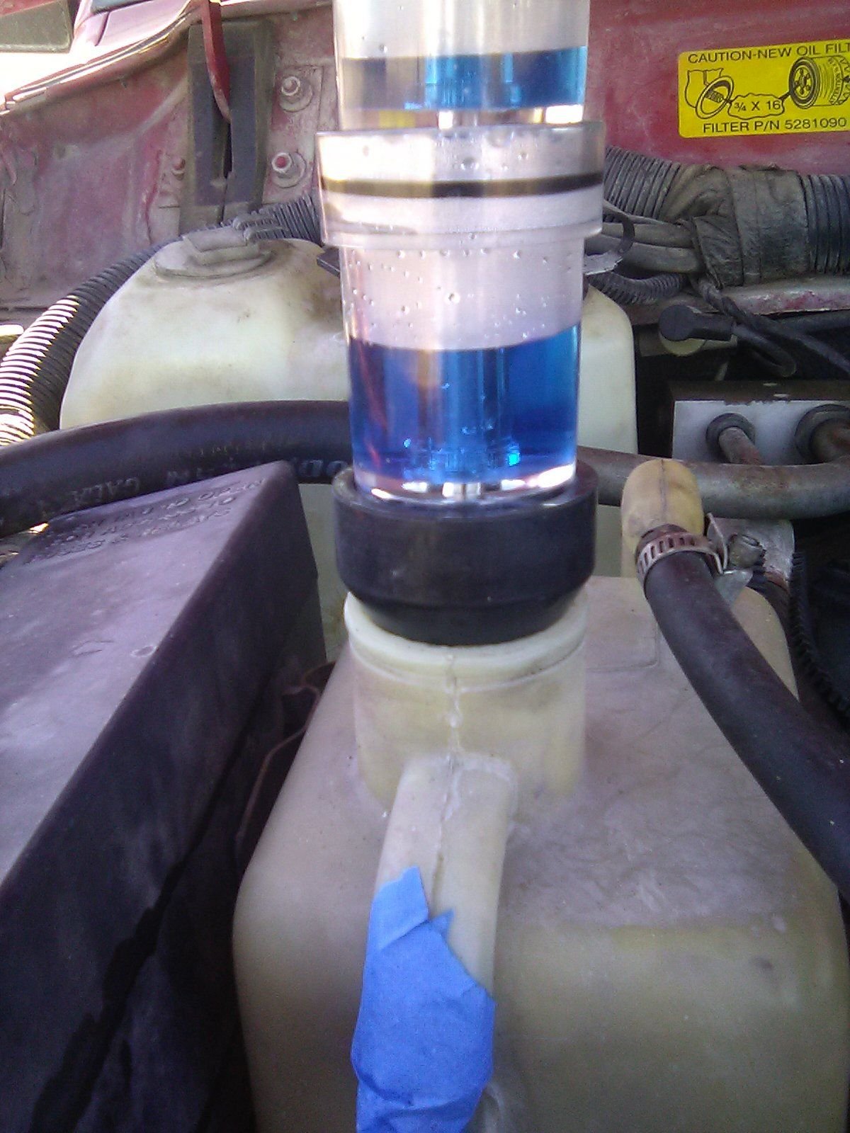 I brought the coolant temperature up to normal (where the electric fan actually kicked on) and placed the fluid tester over the overflow bottle filler. After 2-3 minutes, the test liquid was still pretty blue (see photo). I was surprised again not to find it turning yellow pretty darn quickly.