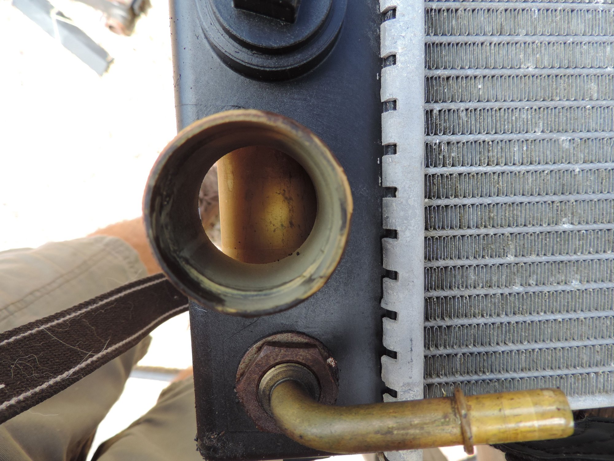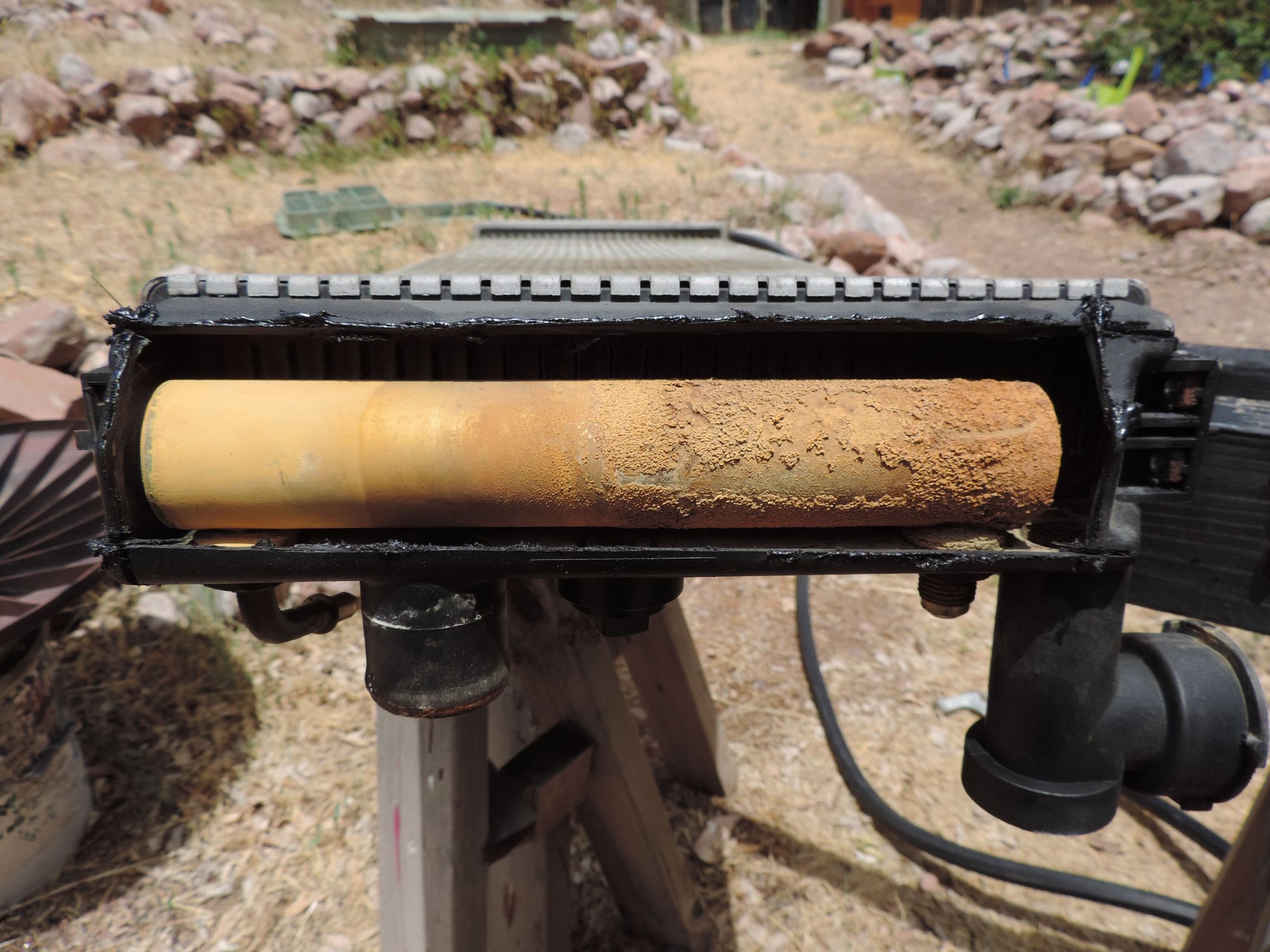 What made the engine overheat to begin with while going up the hill. I cut the plastic headers off and water runs freely thru the tubes. Light deposits on the interior.. See pics.