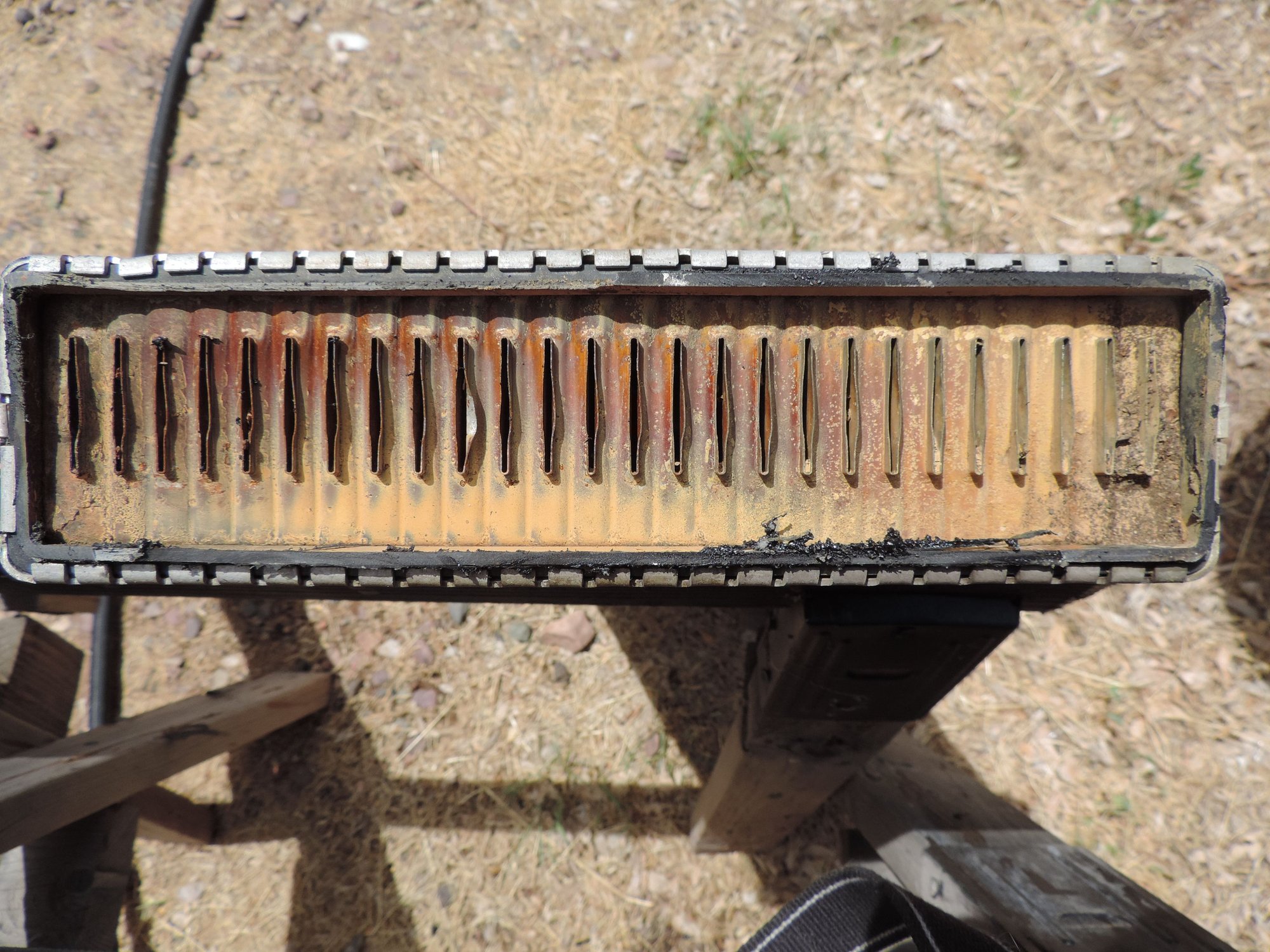 Theres real opportunity to add some tech to predict that ragged edge with averaging stats across the rad, water temp measuring at strategic points, side stream filtering, etc. May try some of these in time. Header split on the hot side of the 9yo radiator. The top is on the right side of the photo. View of the tranny header inside the cool side of the radiator. Cut piece off. Hard to see the restriction it creates View of the tranny header inside the cool side of the radiator. Cut piece on, darkening the photo.. Tranny header. Not to bad for 9yo. The right side is the top. Notice the cleaner side is where the flow leaves the radiator at increased velocity which scours the header clean. Hot end. the right side is the bottom of the radiator. There was flow through all the tubes but the bottom appears to be more restricted.. Settling when the engine is off, etc.