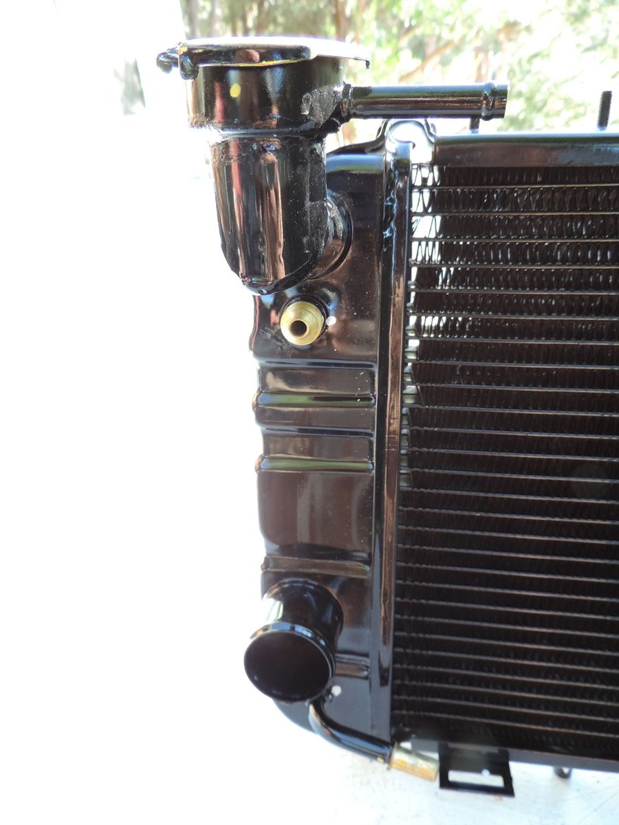 So here are a few photos. The CSF transmission cooler tube has 2/3 the surface area of the Spectra. Same length, 1" vs 1 1/2" diameter. Less heat transfer from the trans oil and doesnt block the outlet near as much. I took some scope pics to compare to in a year or so. All in all Id say it has about the same heat transfer characteristics as the single row Spectra. BUT... its all brass & copper. My CJ5 all metal radiator is 30 yo and still in great shape. I replaced the 1st one at 20 years when I did a rebuild.