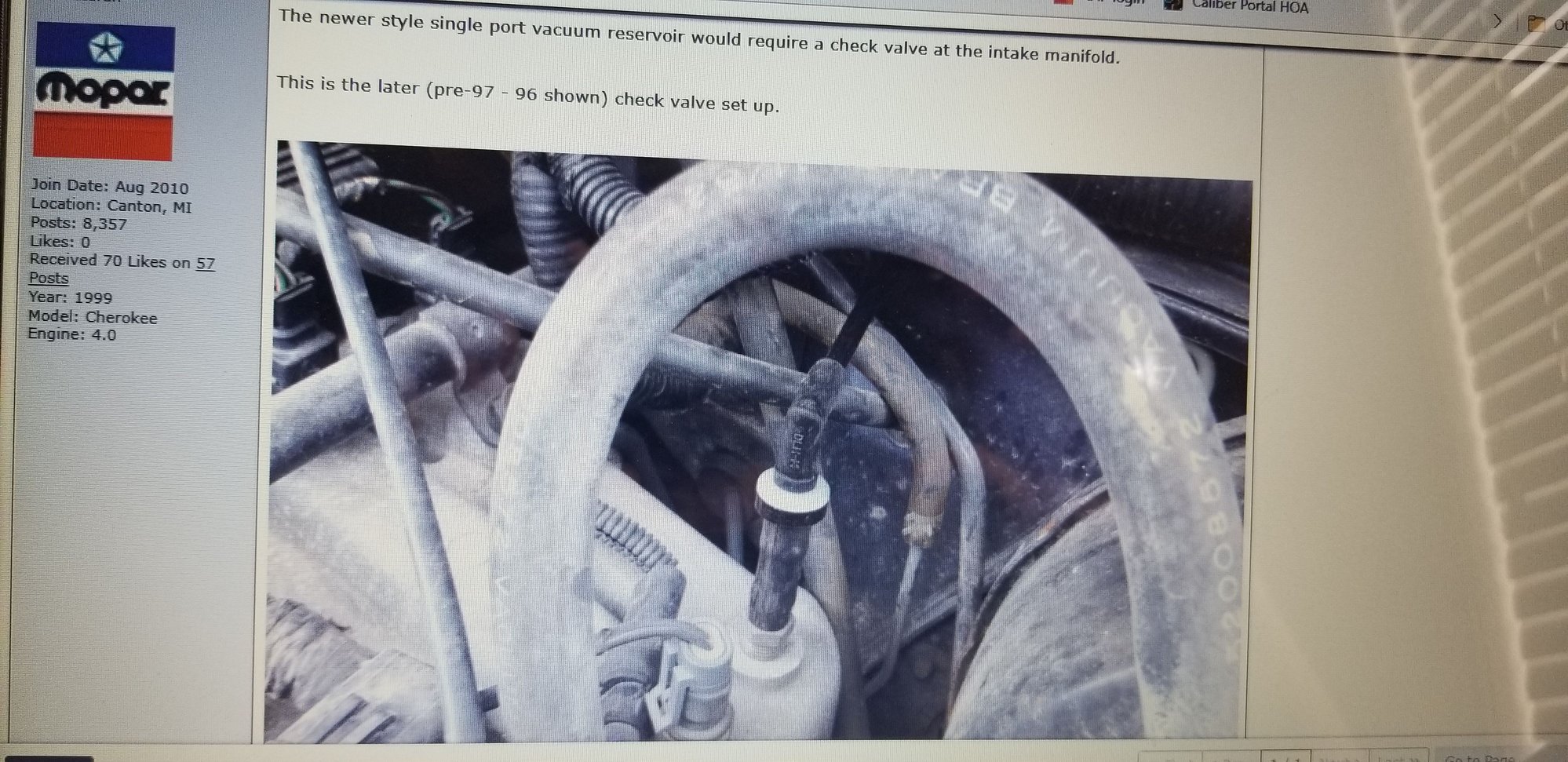 I ordered a 91 Crown reservoir from Amazon along with some new 1/8th tubing. I'll see if I can dig up a 3/8th one way check valve for the nipple at the intake manifold.
