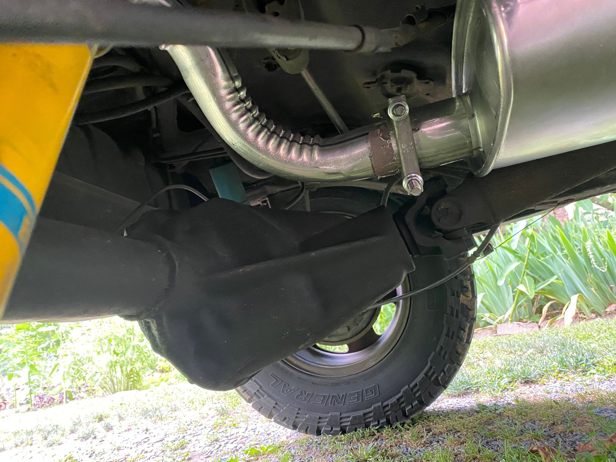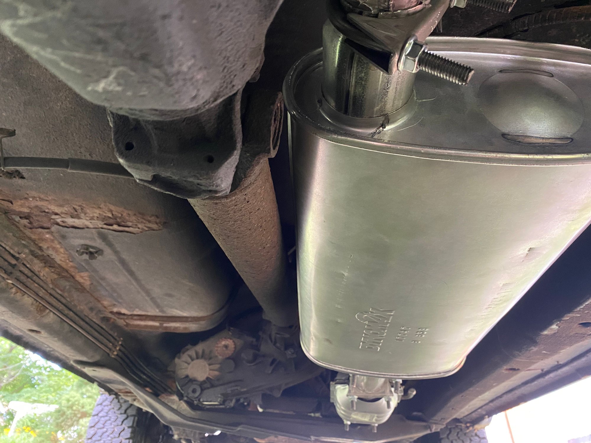 I’m thinking I need to switch back to my Thrush cherry bomb. That drive shaft being so close to the muffler makes me nervous. Not happy with the tail pipe against the shackle either. Tried heating up the last bend in tail pipe and unbending it but didn’t work.