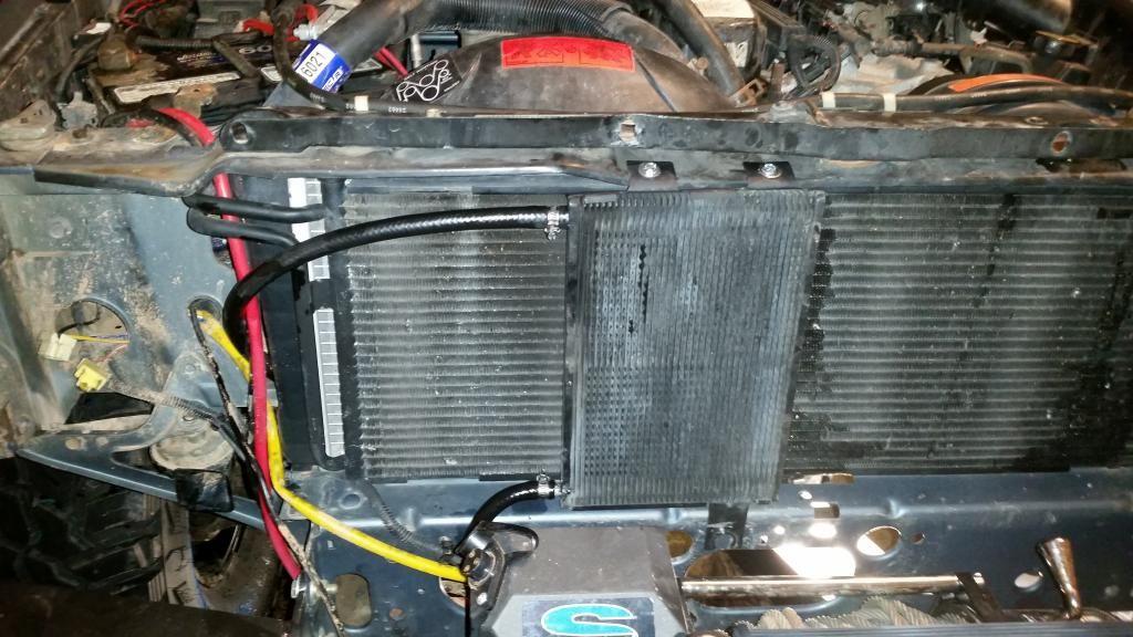 I grabbed a plate-and-fin style cooler out of a first-gen Ford Explorer for $10.You can use the stock Explorer cooler brackets to attach it to your unibody. I bypassed the radiator for now, but likely will reconnect it when it gets colder. I would mount it before the radiator loop. Less heat going into the radiator that way.
