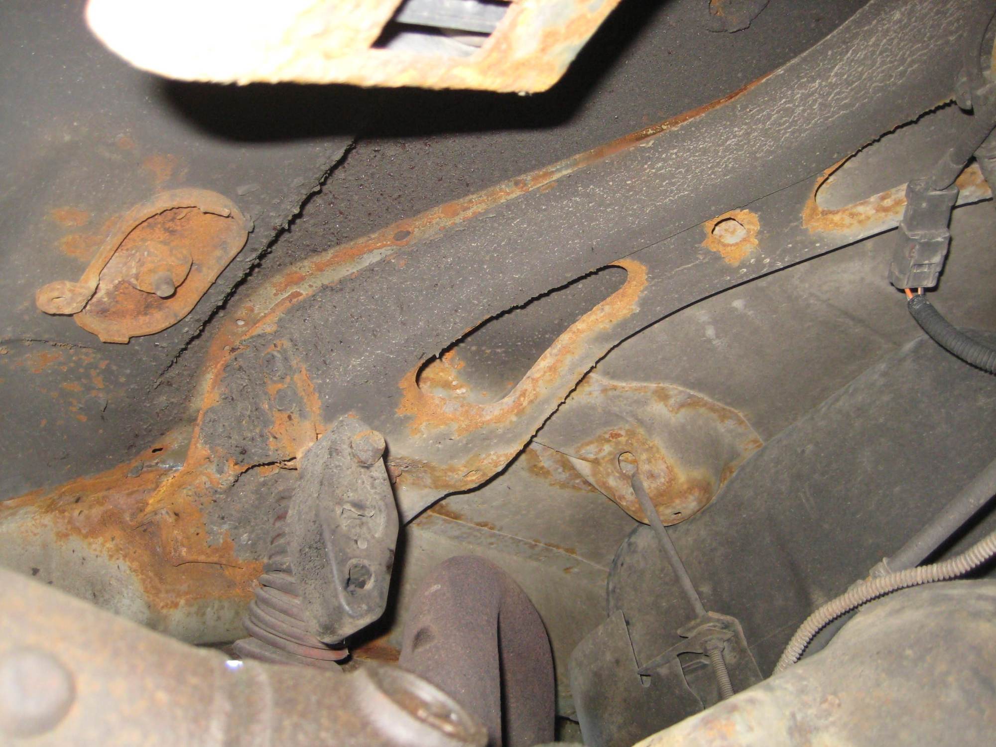 Believe it or not the shock bolts came out, its that whole steel structure that pulled away from the frame and the floor. Im assuming that. "Y" piece with the nuts on them slide up into the crossmember and are used as replacement nuts if the original ones are rusted or broken