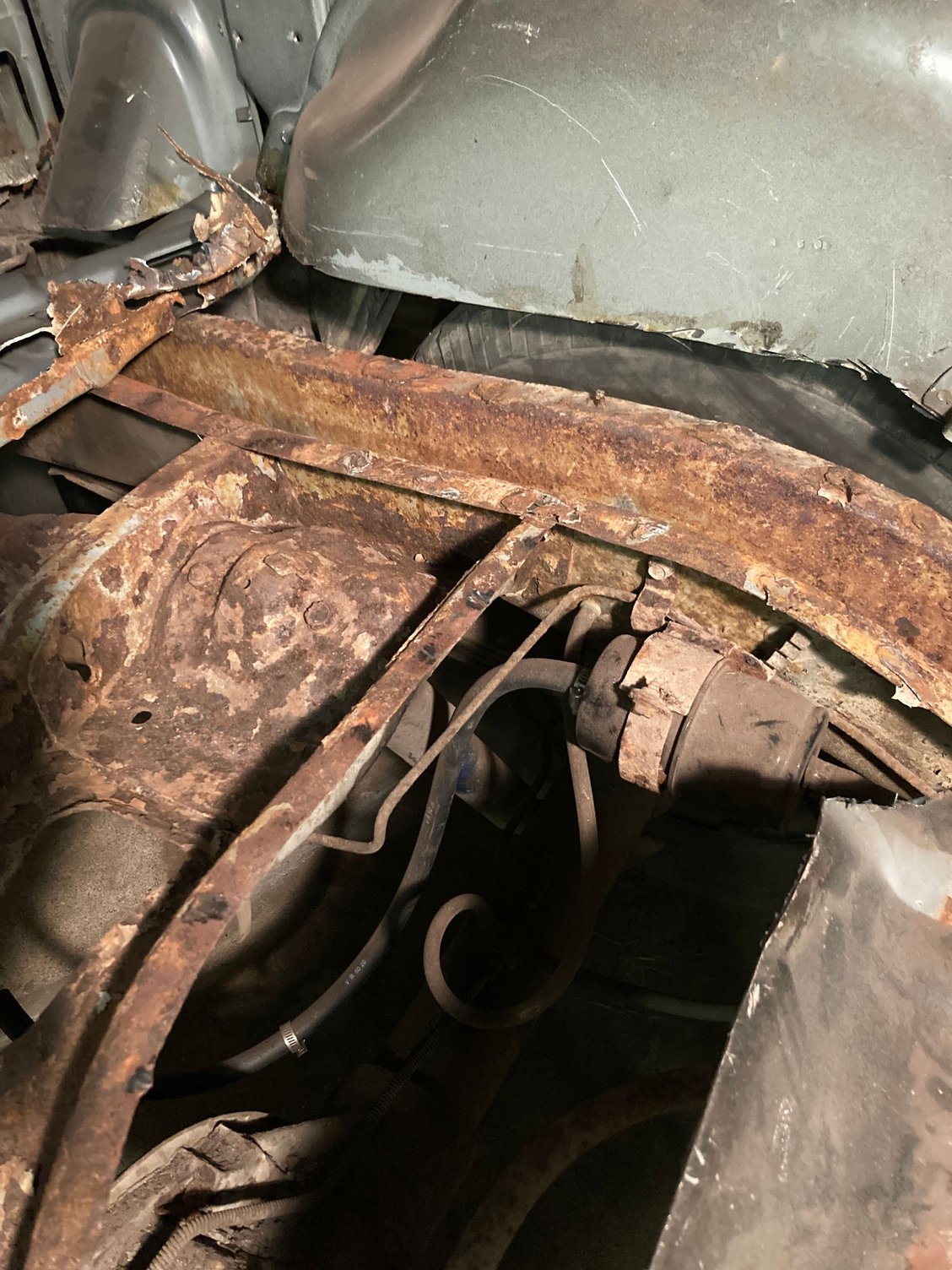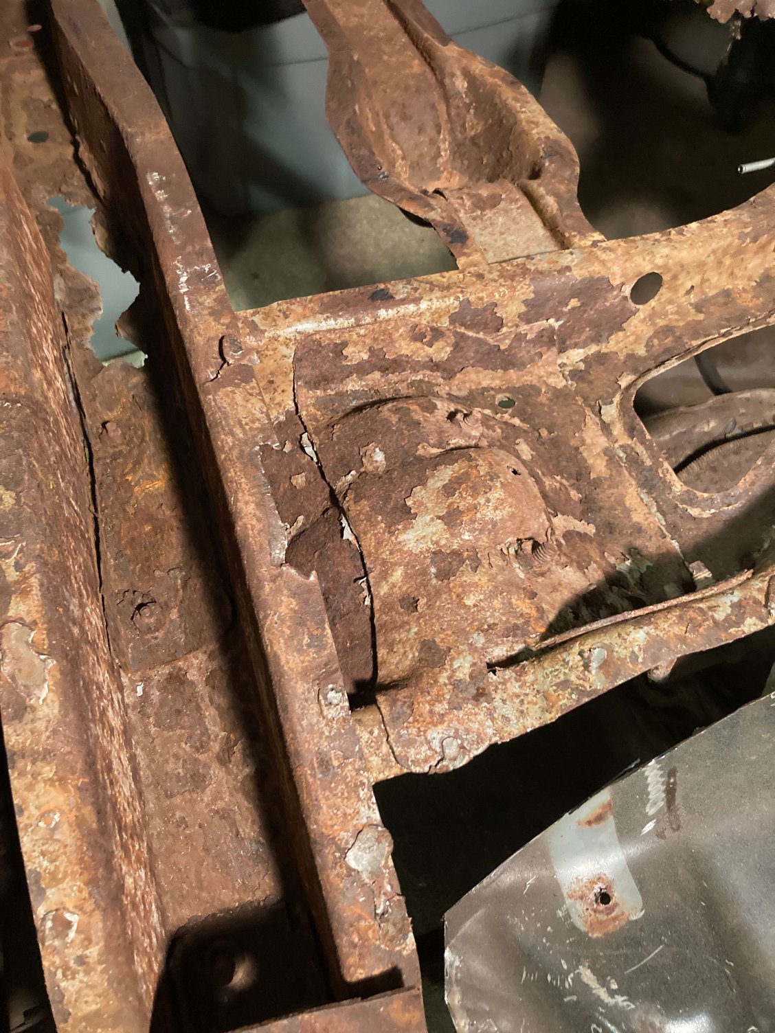 Its tough to see with a camera...no real contrast. The main welds are where the crossmember meets the frame just outboard of the shock and they are broken on that side. Im thinking about the rear shock adjustable relocation bracket..several companies make them, dont know how good a reweld will work in there.....of course no one has the original bracket anymore