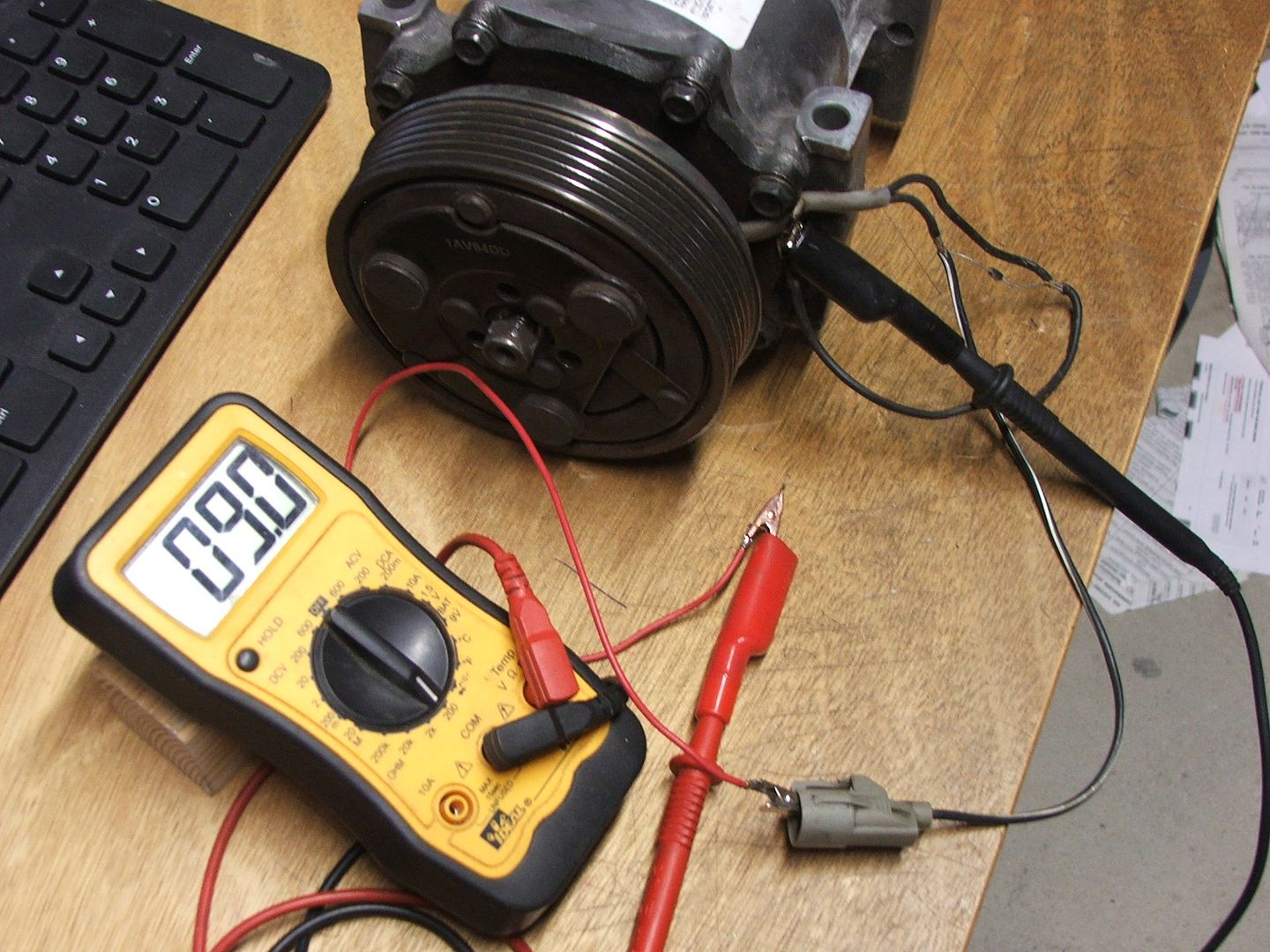 The pic below shows me bench checking the clutch but it can be done insitu. With the meter - probe to the ground screw on the compressor and the meter + probe to the pin in the compressor connector.