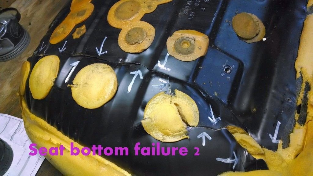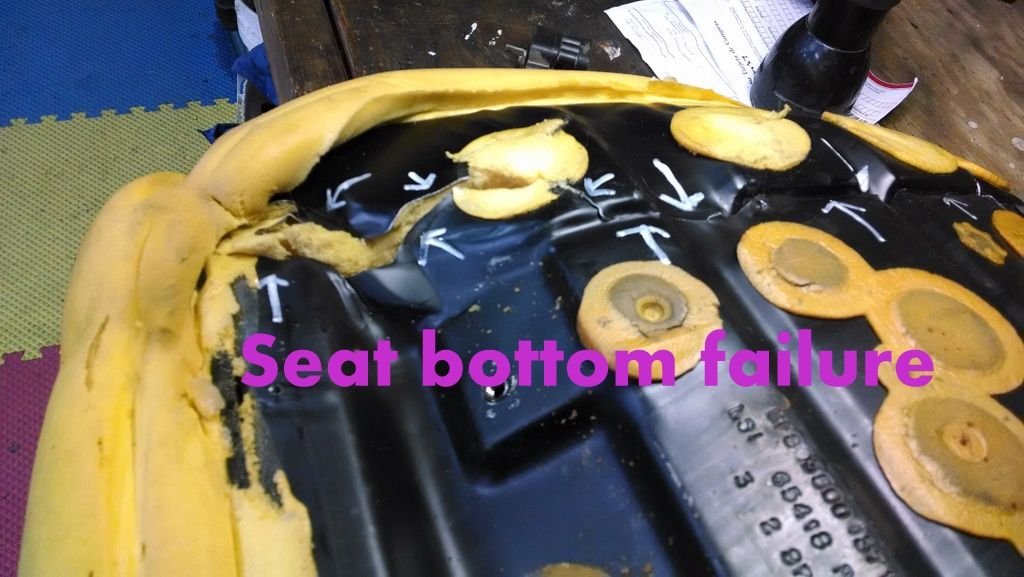 Here's a pic of the cracked driver seat from my '88. All better now with the '90 parts. Note, the red circles show the mounting hole locations. You can see how far the cushion edge is from the support.