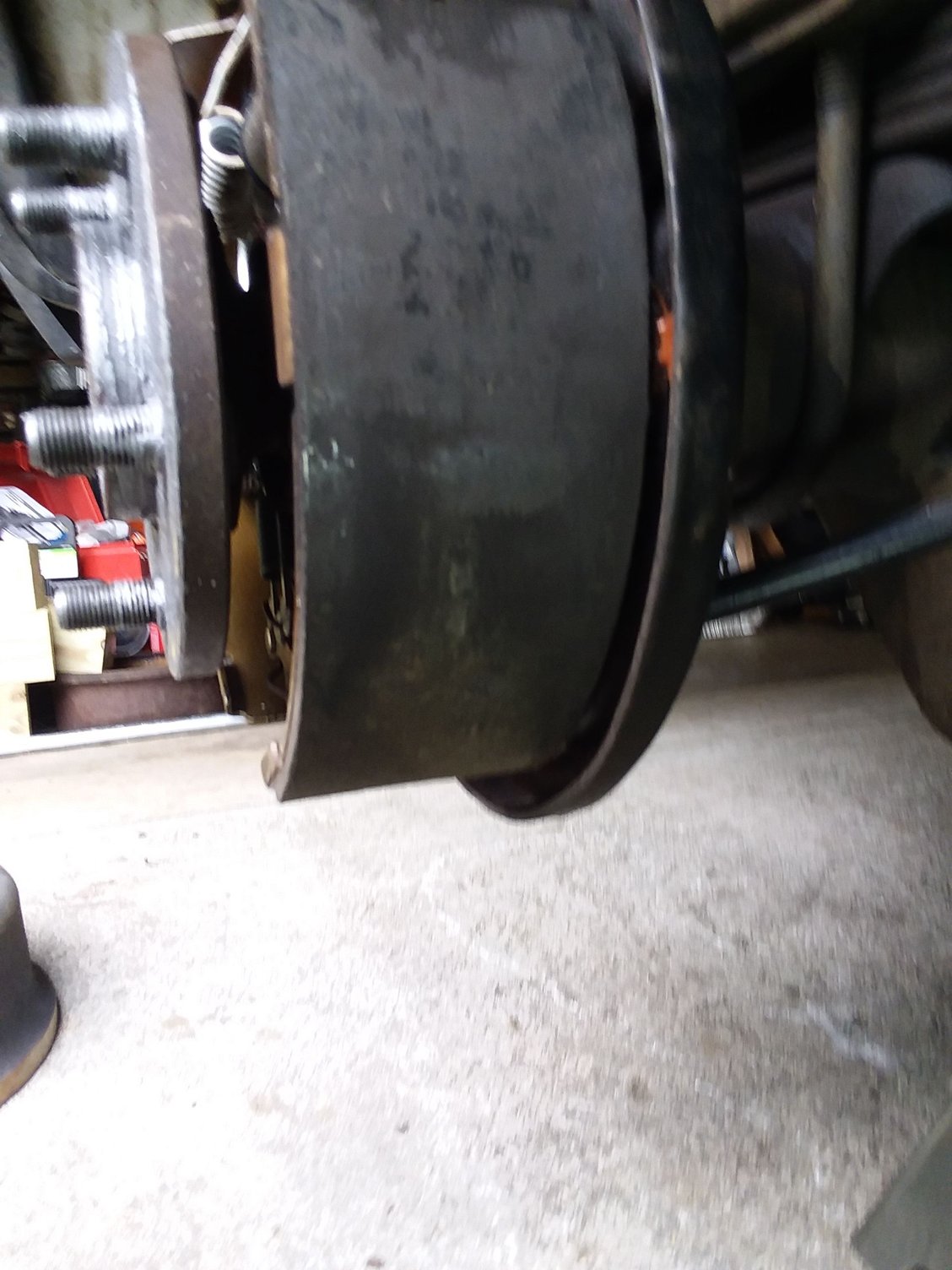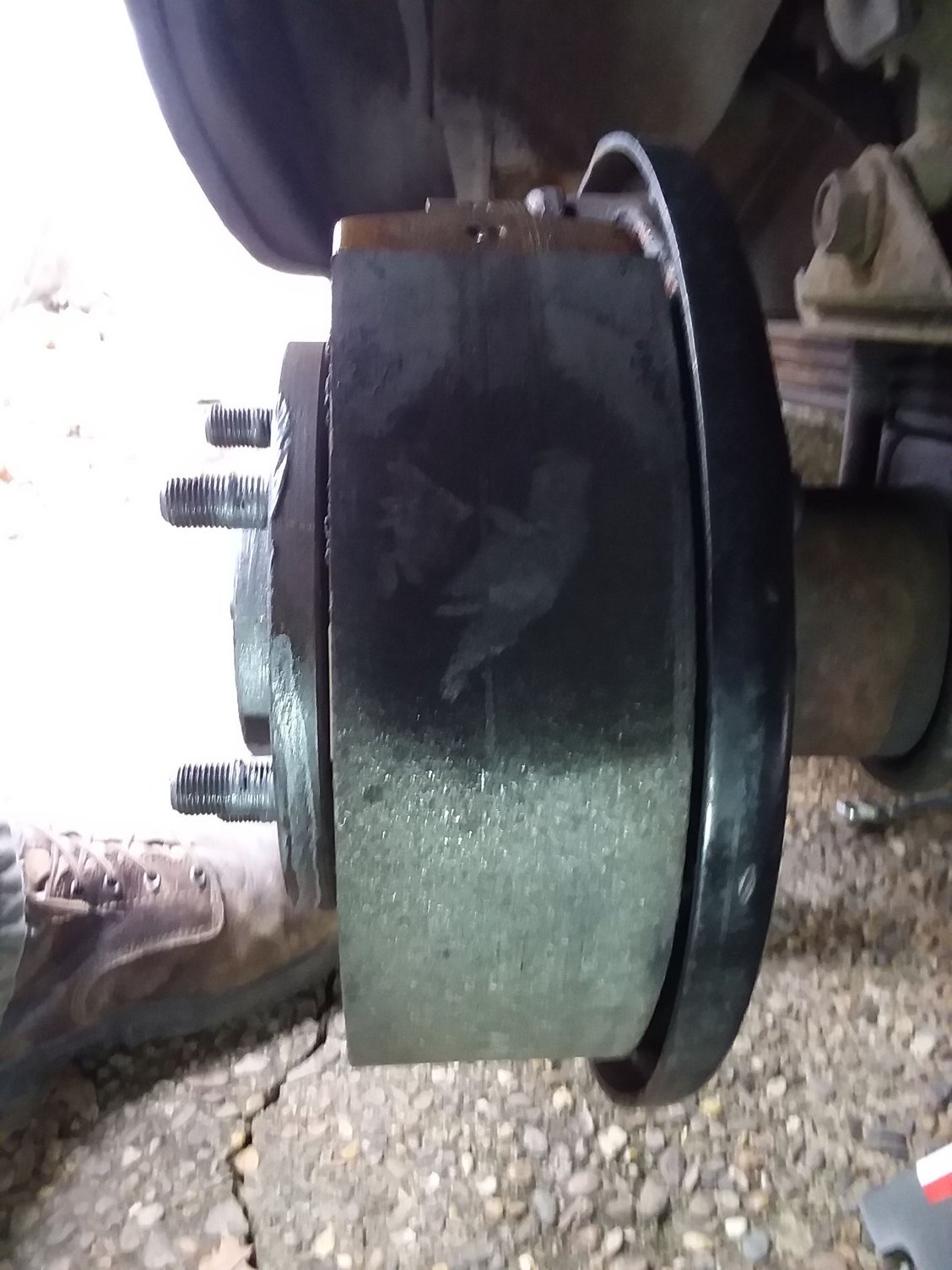 Passenger side lead shoe. Passenger side trailing shoe. Pronounced straw color of machined edge of drum.