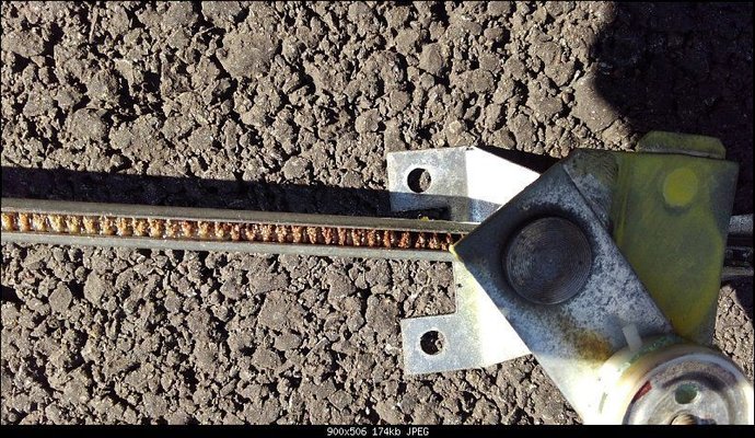 Next I used a screw driver and needle nosed pliers to gently splay the ends of the regulator split tube / cable guide and then pulled the cable out. As suspected the tail end of the cable was rusty and worn where the window crank gear teeth meshed with the coil cable when the window was all the way down. The head end of the cable is pristine so all that was needed to get it going again was to swap ends.
