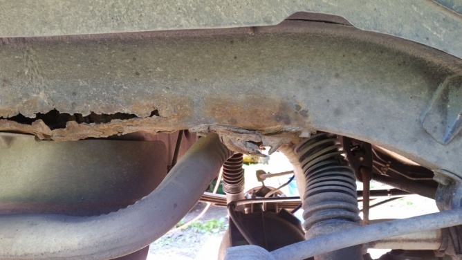 As far as I can tell, this is The Bad Spot. There's a bit starting where the bump stop fits against the other rail, but it's just starting there. Easily fixable. The trailer hitch is shot, and it's coming off. It's scary to think what I've been towing with that. I'll post pictures later.