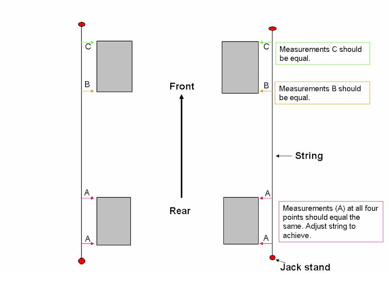 Measure the front tires on the sidewall at both leading and trailing edges at the string. The measurement should be equal on both sides for the leading edge. The measurement should be equal on both sides for the trailing edge. The leading and trailing edge measurements can be different. The difference will be the toe setting.
