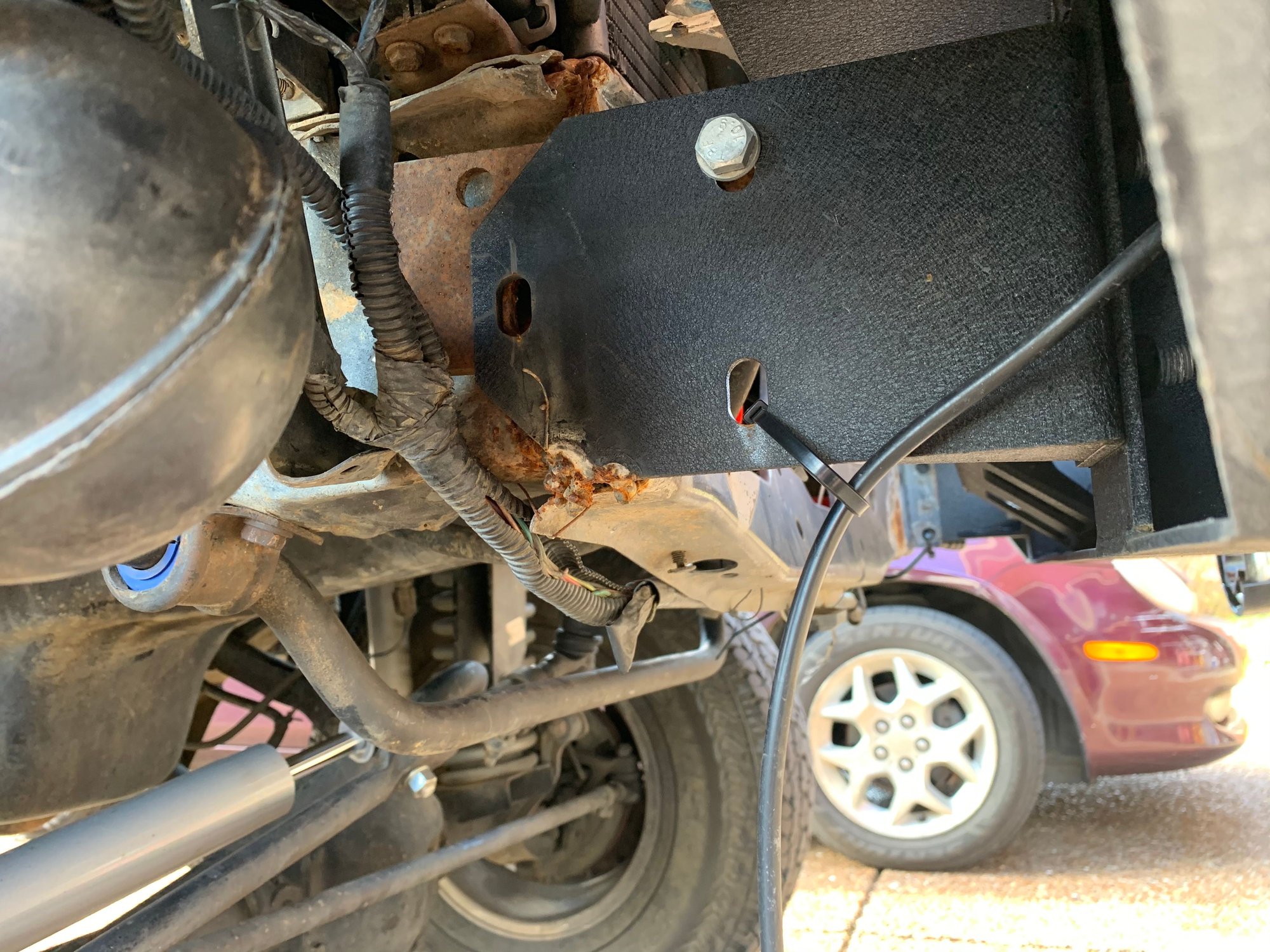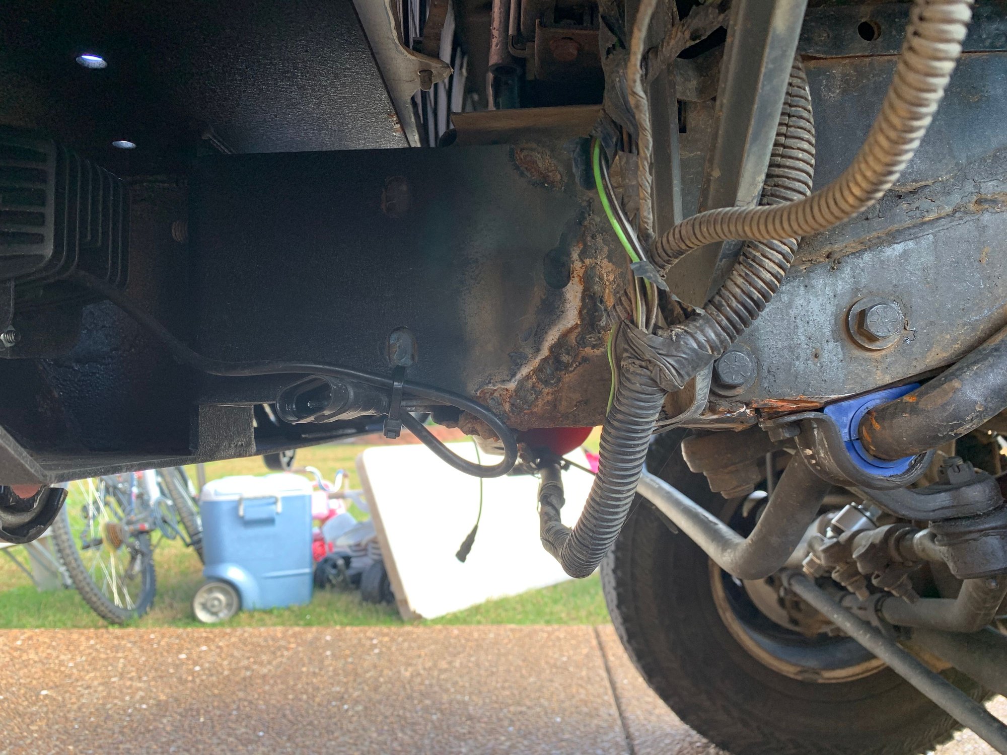 Note: That left sway bar strap appears to be bolted to a rust-exfoliated section and it's pretty much gone. I'd look to weld repair that as well.