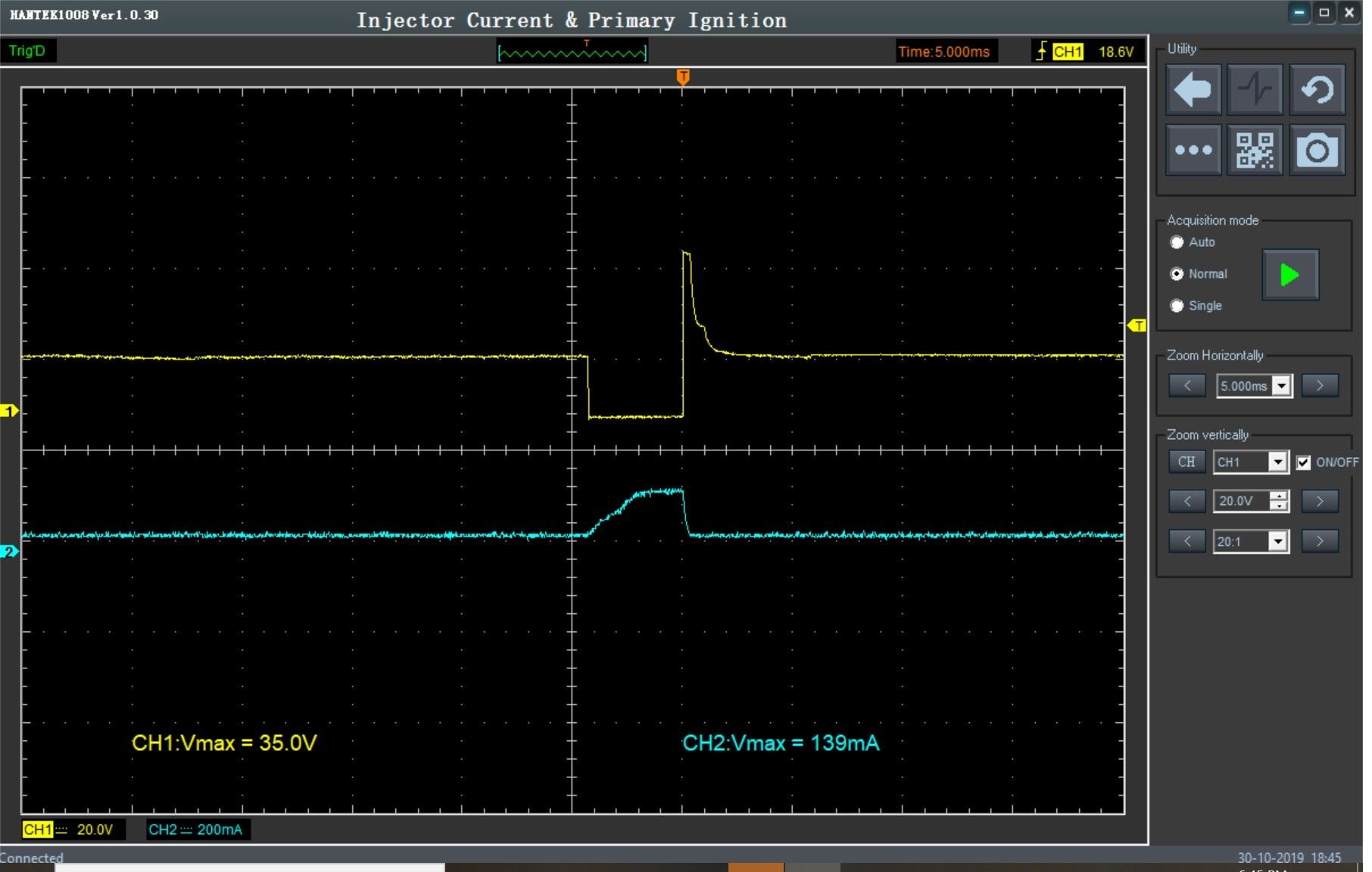 *I get now. Ch 1 is reading 4 volts/division, you can see when it grounds the injector that the baseline isn't lined up, but you can count a bit over 3 divisions, making the B+ about 12 vdc.