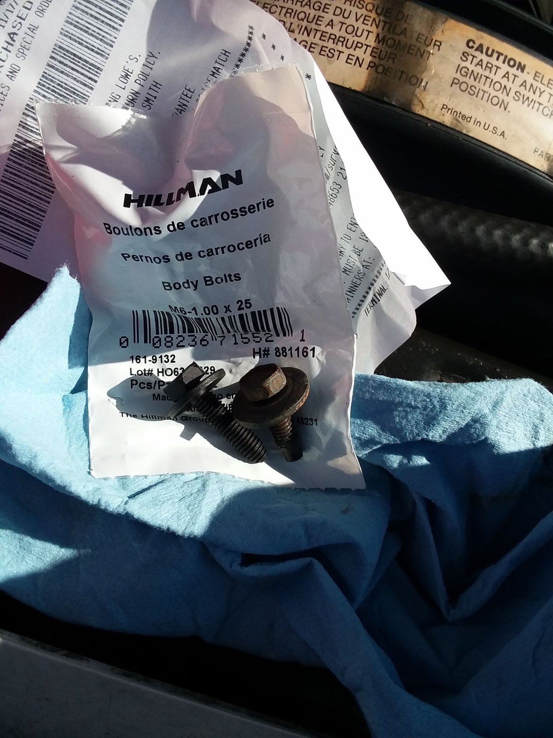 Side note, the six bolts at the ends of the upper radiator support are M6x1.00, 10mm head and Lowe's has very similar bolts for less than $2 a pair. They have thread farther down and are a little longer than the OE, so be careful and check if there is anything behind what you are installing them on. Stock on the right, Lowe's on the left.