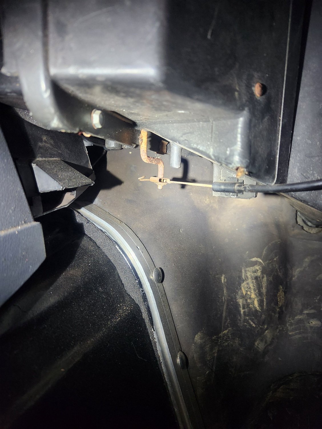 The upper control just directs the air to the indicated setting, the lower control determines the temperature. With your rig at operating temp move your top control where you have good air flow out of any of the settings, and move your lower control all the way to the right, you should notice a temp change. If not the first place to check is the blend door (easy for you with a 1990), attached is a photo that is just to the right of the transmission tunnel on the passenger side under the dash. It shows the blend door control rod controlled by a cable, in the photo it is in cold setting if it was in hot it would be all the way to the right against the stop. Find this and while looking at it move your lower temp control slide back and forth, the cable should move the rod. If it does not move likely your control panel is broken, if it does move then it is time to move to the heater core. There are many posts and methods of flushing the heater core.