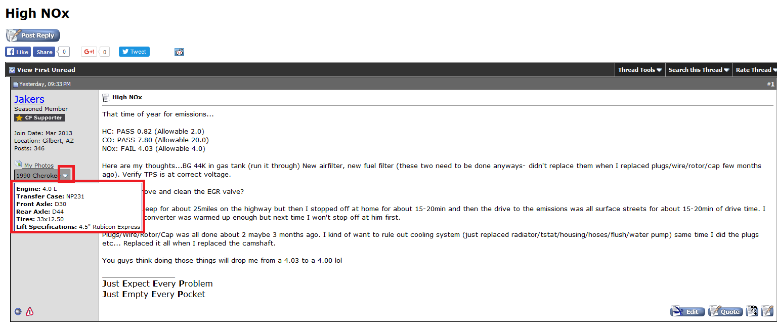 HC: PASS 0.82 (Allowable 2.0) CO: PASS 7.80 (Allowable 20.0) NOx: FAIL 4.03 (Allowable 4.0) Here are my thoughts...BG 44K in gas tank (run it through) New airfilter, new fuel filter (these two need to be done anyways- didn't replace them when I replaced plugs/wire/rotor/cap few months ago). Verify TPS is at correct voltage. Should I remove and clean the EGR valve? I drove the Jeep for about 25miles on the highway but then I stopped off at home for about 15-20min and then the drive to the emissions was all surface streets for about 15-20min of drive time. I imagine the converter was warmed up enough but next time I won't stop off at him first. Plugs/Wire/Rotor/Cap was all done about 2 maybe 3 months ago. I kind of want to rule out cooling system (just replaced radiator/tstat/housing/hoses/flush/water pump) same time I did the plugs etc... Replaced it all when I replaced the camshaft. You guys think doing those things will drop me from a 4.03 to a 4.00 lol |