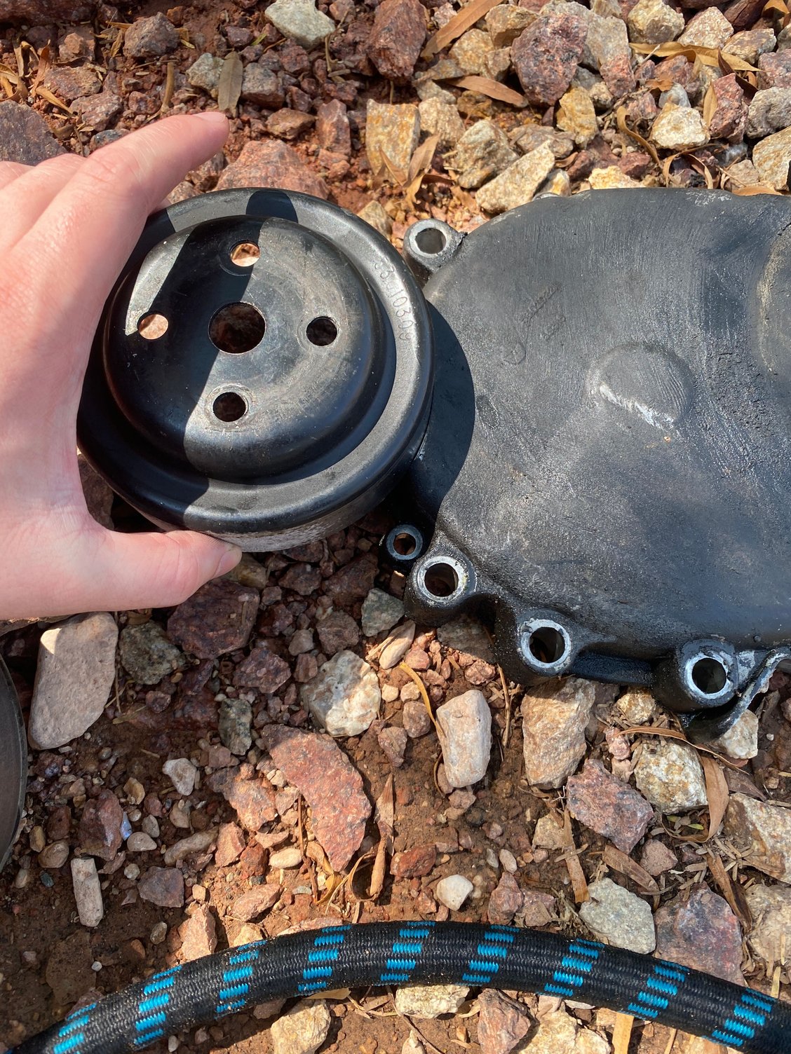 So I'm not sure if anyone has ever seen this or dealt with this before, but I've had a leak from the front end of my engine since I bought the Jeep a few months ago. It was always a small drip or two so I just assumed it was a gasket. I finally ordered the timing chain stuff I needed and when I got my cover off I was greeted with a nice hole worn into it from the fan pulley. Now it seems like the PO knew this was an issue and has since put 3 little washers on each of the fan pulley bolts. So I'm just wondering if I get a new compressor bracket would this solve my issue? Or am I just trying stuff and seeing what works. I'd rather not have to buy another timing chain cover, so if anyone has seen this before and has a fix let me know! Fan pulley fits perfectly into the slot Didn't leak a ton because it was high up