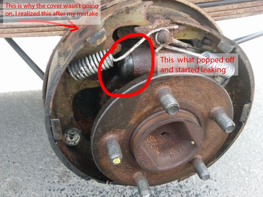 I was in the process of diagnosing what a clunk sound was in the rear of my jeep and when I was about to put the drum cover back on, I wasn't able to do so. What I decided to do is to apply some pressure on the brakes to see if it would move anything. Oh what a big mistake, I heard a pop and brake fluid started pouring out (I'd say about 4-5oz total before I fixed the leak). Since I have no idea what every part is named, I took so pics that I posted below in order to show what happened.