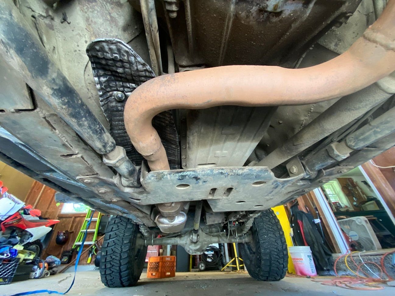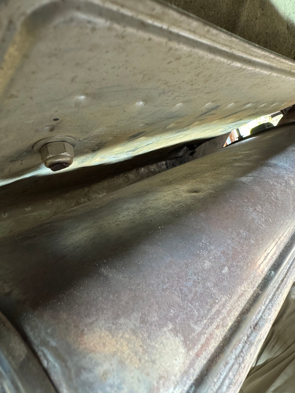-AirBake cookie sheet heat shield over muffler. Got pushed up into the floor last year. Did my best to pry it back down. Needs more attention.