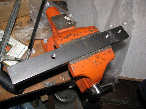 The real disapointment happened here. I had manufactured two "nut bars" out of 1018 steel. 1/2"X1.5"X12" each, with 3 threaded holes for a 13 thread/inch 1/2 inch bolt. Unfortunately, one of the holes on the car is on a separate pannel than the other two, connected by an oval hole. The bar would not lie flush, so I cut off one hole on each bar. That took care of that. On the side with the exhaust pipe, a nut was also deep in there, but in the way. Cutting off some of the extra metal at the end of the bar allowed clearance. Slid these in, bolted it up, and just put the bumper back on, missing a bolt.
