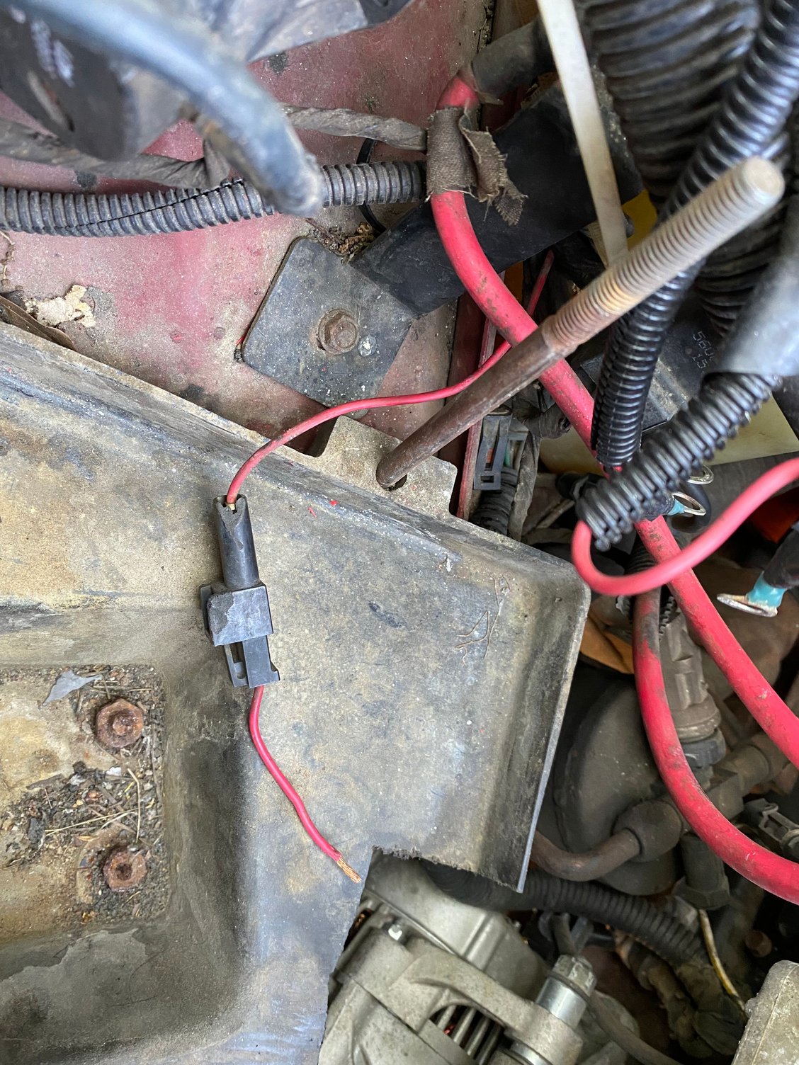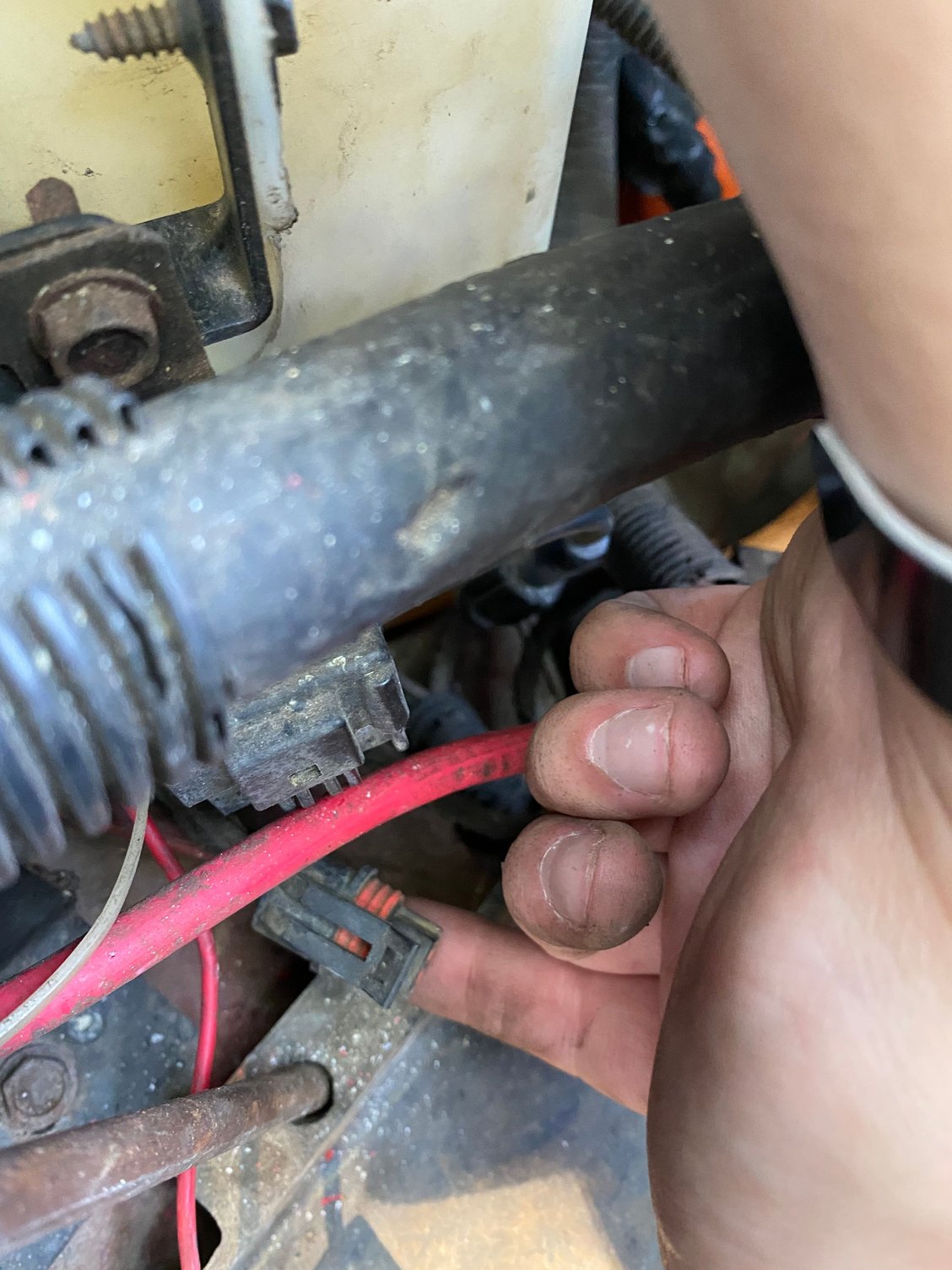 Background: I have always had starting/idling/electrical issues. I always attributed it to the previous owner allowing the jeep to sit for a few years and jury rigging things together improperly. I also discovered this unplugged connector and im not sure what it goes to either. It appears to have a purple wire and a blue/black wire coming from it. Both are directly behind the battery, near the cruise control vacuum and PDC. First photo is mystery connector. Second photo shows where mystery wire and mystery connector lead to. Third photo is mystery wire that is currently connected to pos terminal.