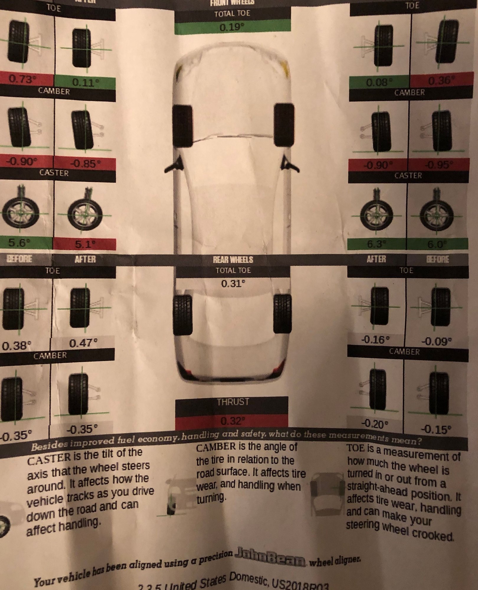 If the OP had a professional alignment shop do the work they would have checked ball joints, tie rod ends and wheel hubs for play before even starting the process and would have said that they could not proceed with the alignment until all worn parts were replaced. That said, without any punctuation the OPs post is a bit confusing. I'm not sure if he said he needs one ball joint or has new ball joints. If I am reading the alignment sheet correctly, I see -.85 LF and -.95 RF which is not excessive. Typically you run slightly more negative camber on the right front to compensate for the crown in the roads for left hand drive countries. I would call it good and move on.