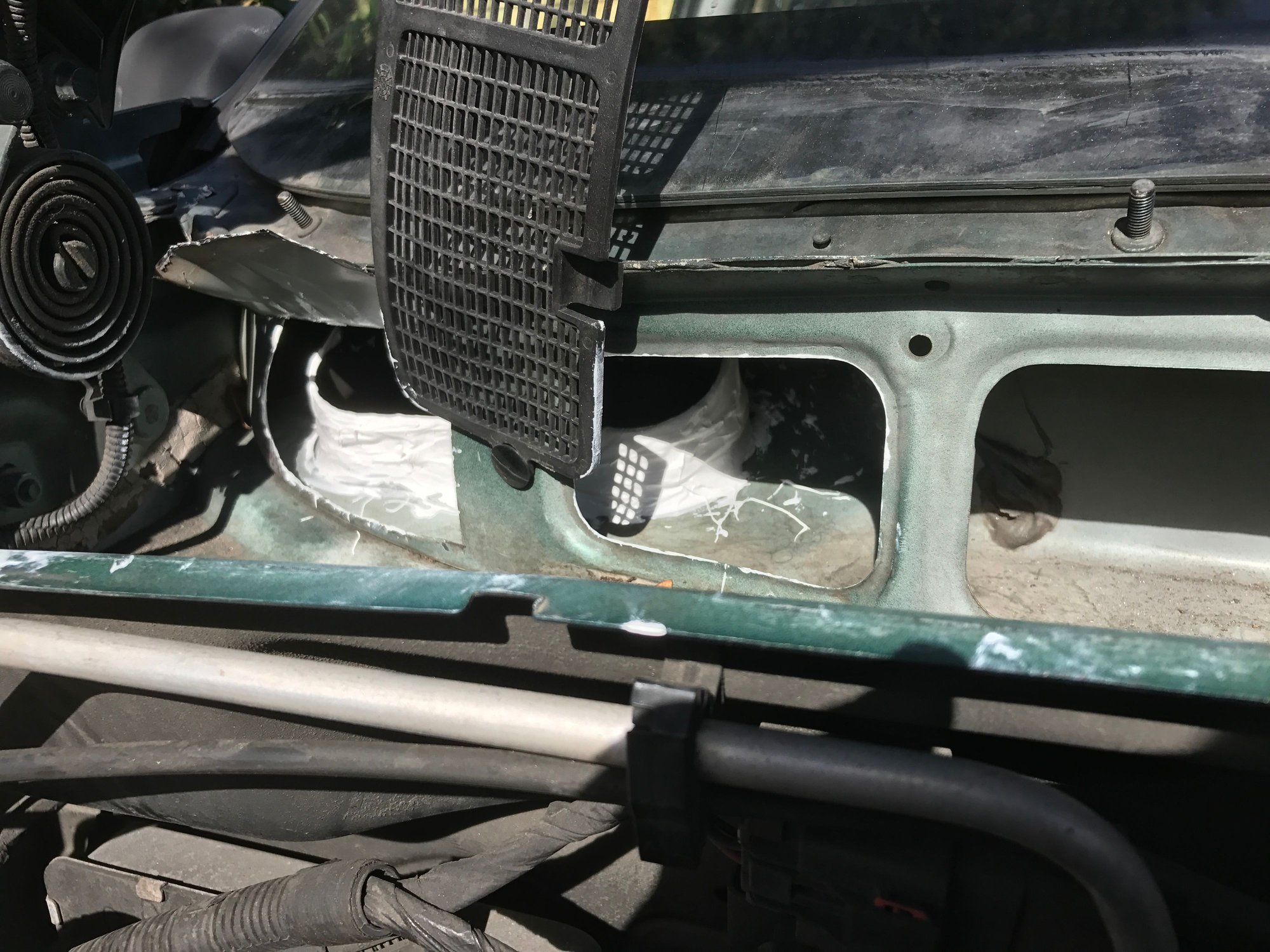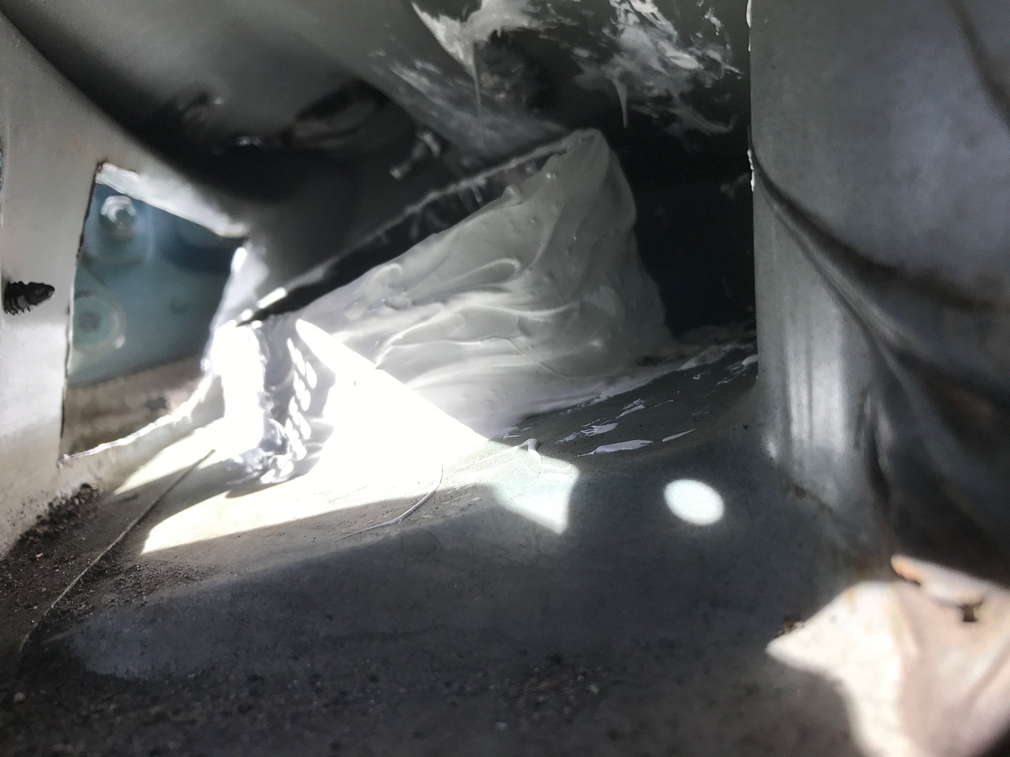 shows the intake with the metal lip. whater gets over the lip and goes to interior dremmel tool to cut steel. only cut 3 sides to leave a flap access to intake with both hands. i just coated the whole thing to insure no more leaks. one tube of 5200 was more than enough flolded flap back down and sealed for future access.