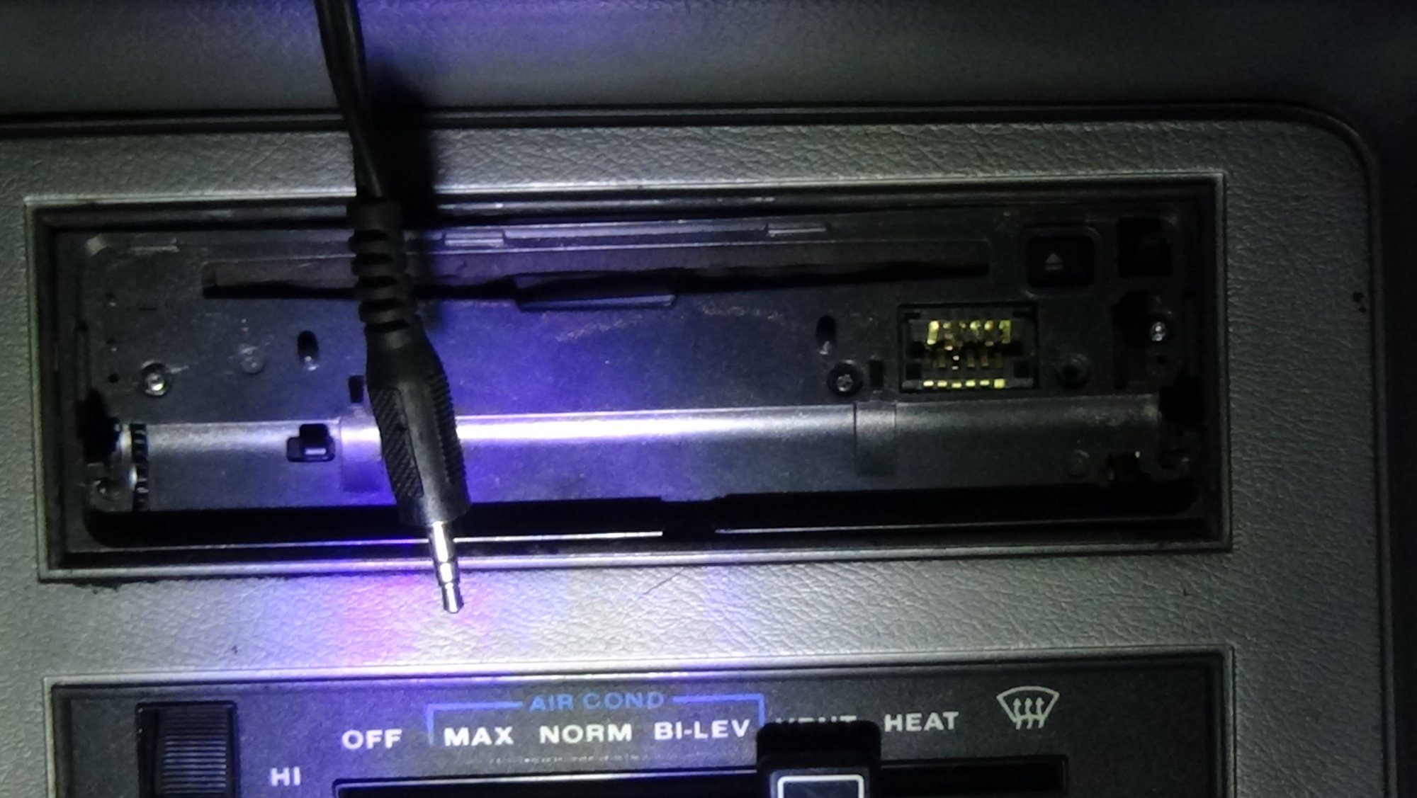 The radio (stereo?) in my jeep doesn't have the front thing (its broken and lost) that has the LCD screen and stuff, but it does have that plug that you can plug into a music player. Is there a way I can play music on the speakers without having that front thing? Is there some connections that I can solder together?