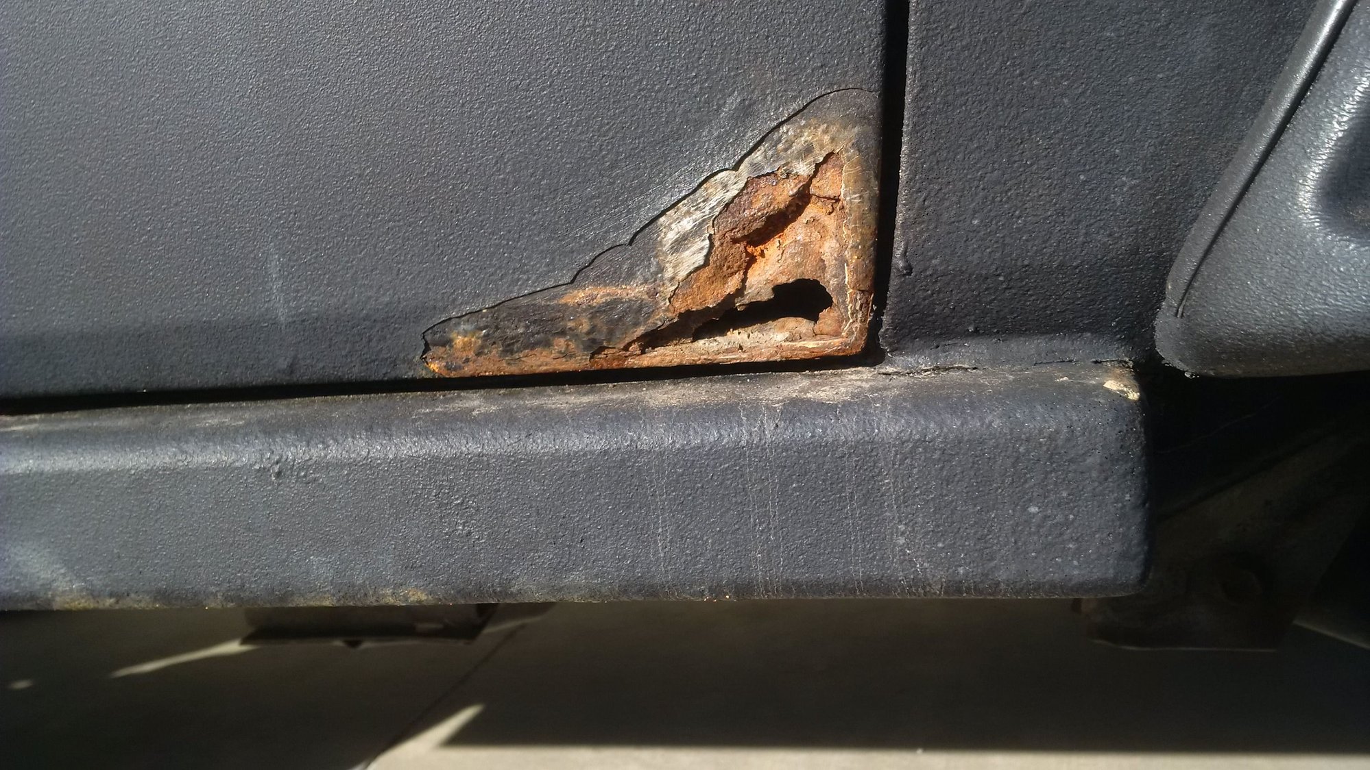 I have a 98 XJ that is in pretty good condition apart from the rusting area (pictures below). A couple years ago we tried sanding and cleaning the area, and patched it with a metal bodyfiller and sprayed bedliner over it, however this spring the rust started showing up again, and it looks like it has advanced further and has rusted through the door. I'm trying to figure what is best to do, ideally without having to purchase a new door, and think the best route is to cut it out further and patch with new sheet metal. Because it has rusted out the corner though, I'm unsure of the exact way to go about this, would anyone have any suggestions? Thanks a lot! Exterior Interior
