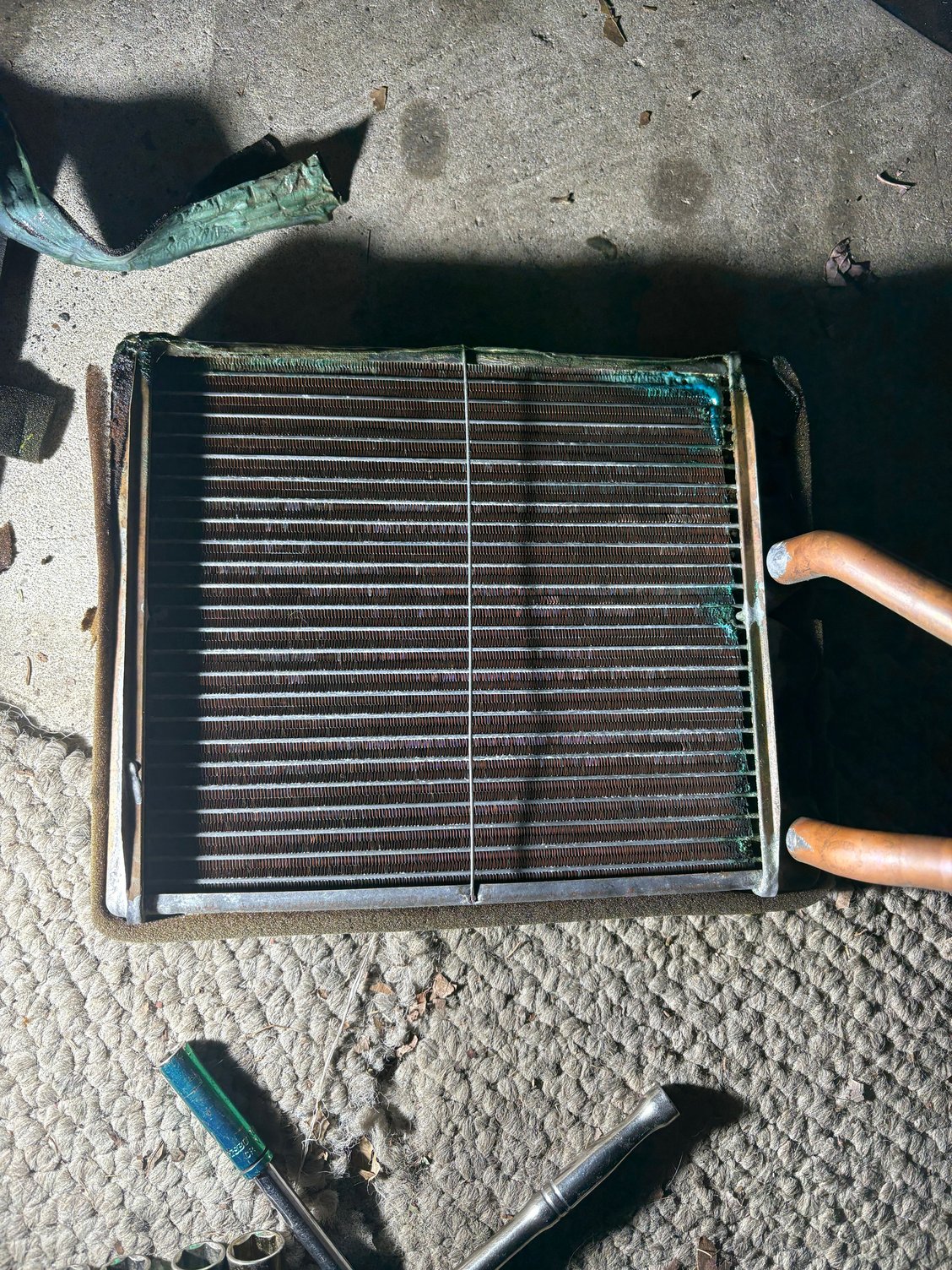 That was one of the ones that the previous mechanic did not put back. Took longer than I waned, but victory is mine today. Took a dremel to the nuts. Verified the heater core was in fact, done for. Was going to reuse the receiver drier, but I could not get the AC line disconnected from that side. The other side relented. So dremel tool for the win again. Should replace that anyway. Can clean it all up and start reassembly tomorrow.Started around 1:00, took a break for lnch. So 5.5 hours. Must have wasted an hour and a half messing with the nuts and the receiver drier.
