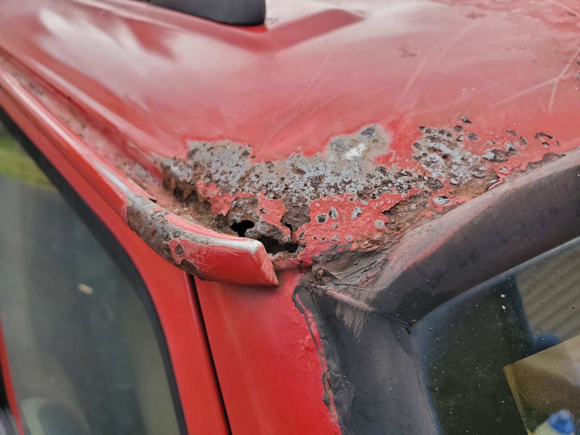 Good news is that the window frame in the A pillars and cowl area is not rusty at all. It's almost all confined to the roof.
