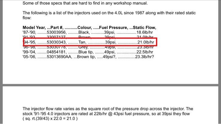 Okay, I did a little research and came up with this chart. It appears as I don't have the 49psi injectors, but, the 39psi version. I showed 32 psi at idle when I checked my pressure, so, that's a 7psi difference (as opposed to 17psi).