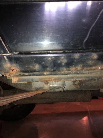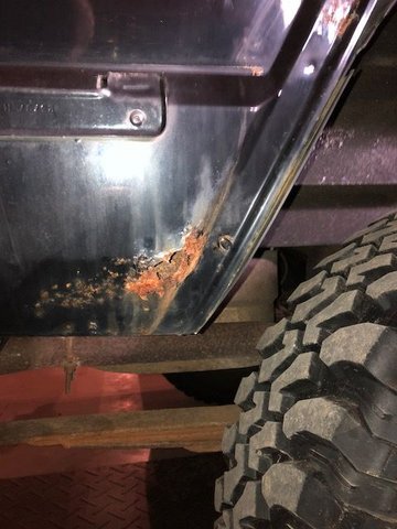 Let's start with the rockers... the rear of both rockers are starting to bubble and the passenger side has a hole about 1/4" in diameter. The metal around the rust hole and bubbled area sounds / feels pretty solid with the "knuckles and fist" test. I bought some black push-in style plastic plugs from the local hardware store. I bought four 1" plugs and eight 1/2" plugs. My plan for the rockers is to drill a 1" hole to (hopefully) remove the rust around the small rust hole. To satisfy my OCD ;0) I would drill a matching hole at the same location on the front of the rocker as well as the same on the drivers rocker. I would also drill four 1/2" holes evenly spaced on the under side of each rocker. Buy Eastwood internal frame coating and blast the inside of the rocker in the 6 holes I created in each rocker. I would then sand the rocker to remove what is hopefully surface rust and prime / bed liner. I realize rockers may be rusting from the inside but for $25 I'm guessing I can get several more years out of the rockers (and maybe forever if I don't drive it in Northern Wisconsin's winters) and it should look pretty good. I could pull the plugs a few times a year to see if any moisture needed to drain. Thoughts on this approach? Passenger Rocker