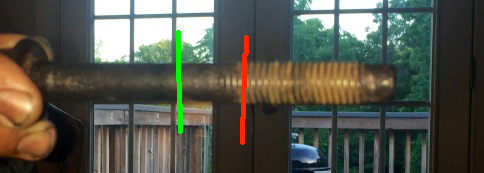 Here is a picture of my passenger side shackle bolt. The green line is about how far I have gotten my driver side bolt. The red line is what I think is stuck in the bushings. I feel that the first thread is getting caught. I am able to rethread it back into the weld nut. Any ideas of what else I should do? I am thinking about putting it all back together and see if driving will loosen it up.