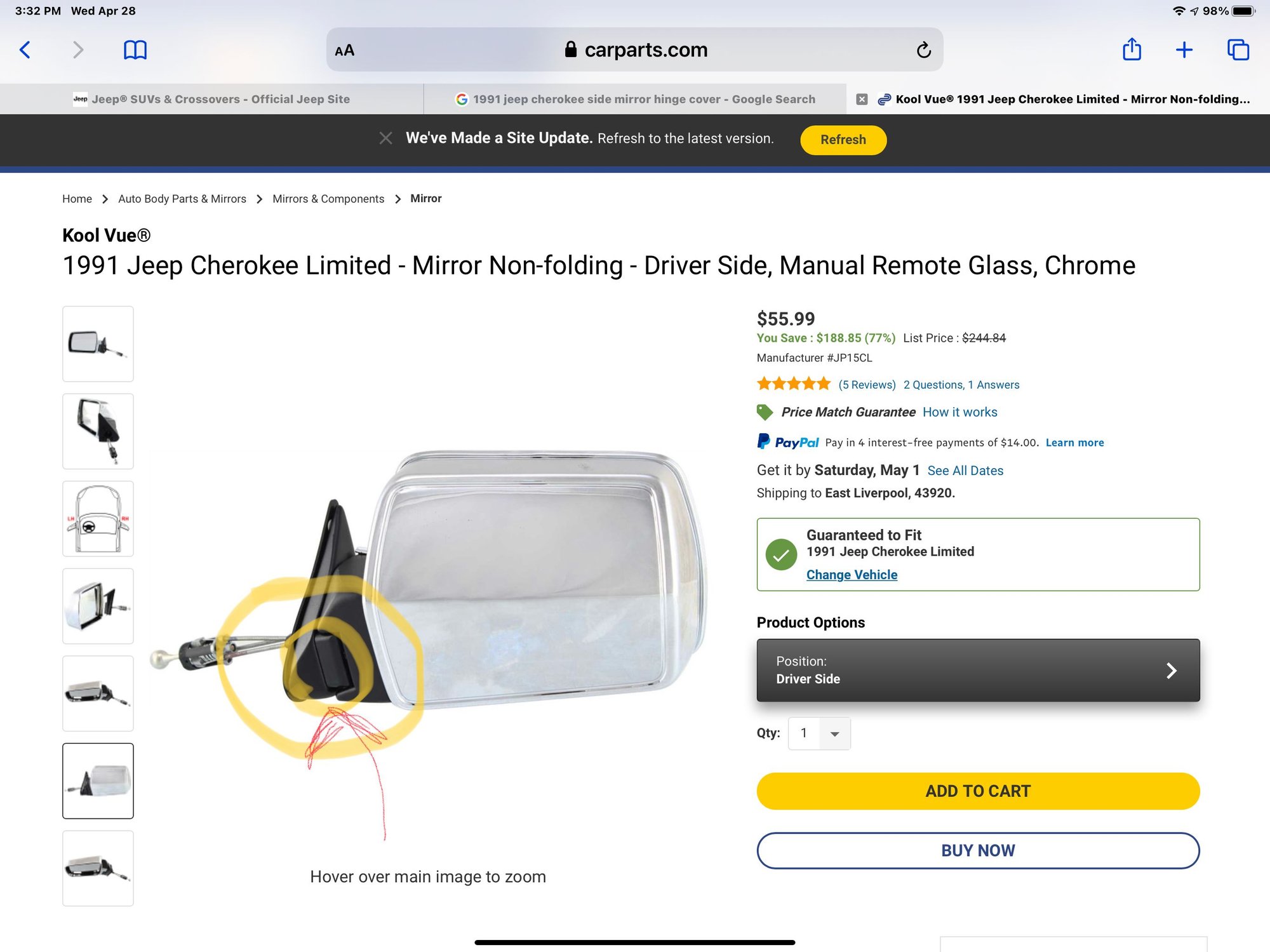 Hello i am not sure what this part is or if you have to replace the whole mirror on my 1991 jeep cherokee limited. I have attached a picture it looks like it’s a cover that covers the hinge of that mirror but I could be way off base anyway it’s broken and I would like to replace it just wondering if I would have to place them here or does anyone know what this part might be called.