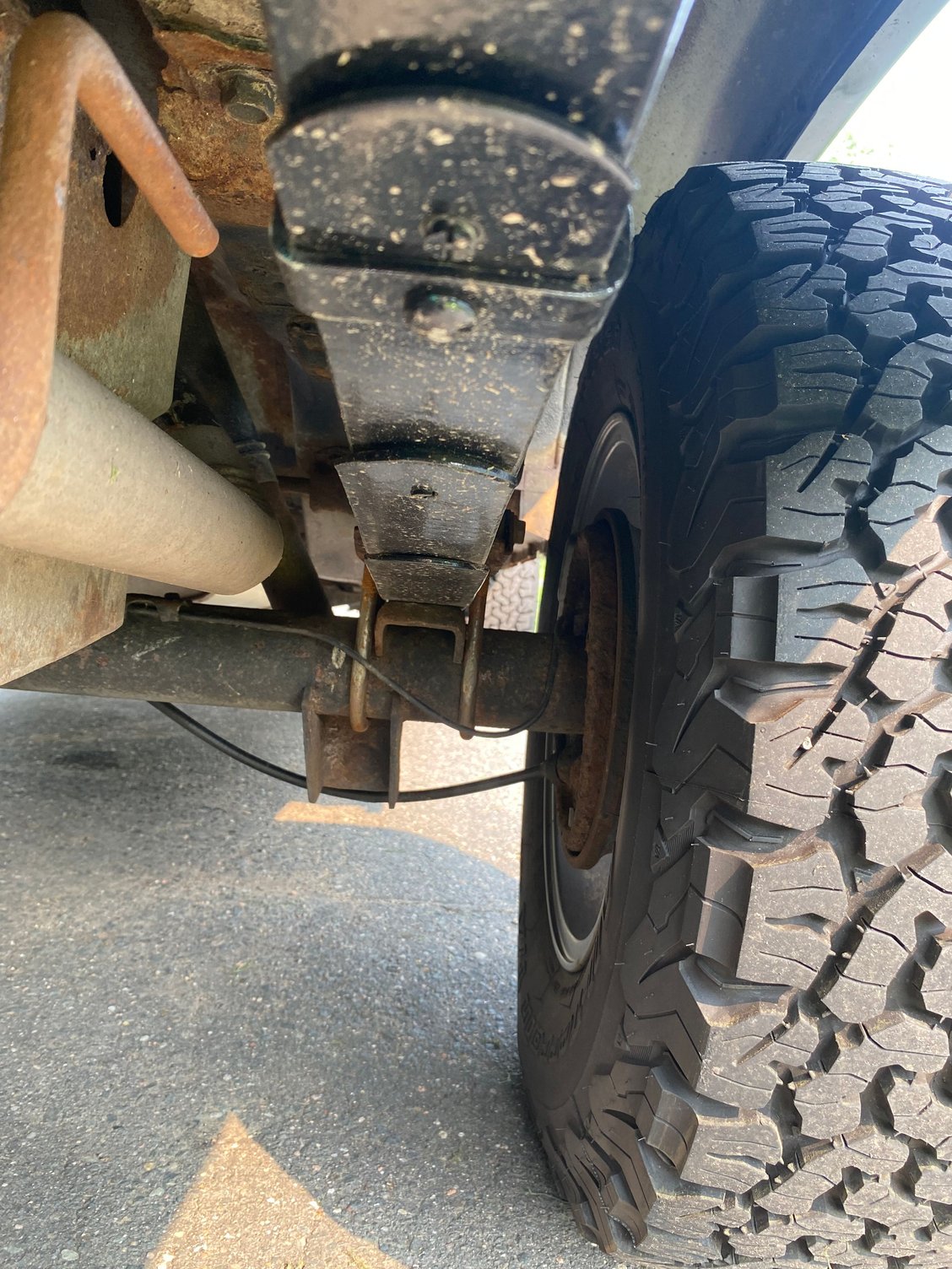 This morning someone blew a red light going pretty quick. I was able to swerve so he didn’t broadside the passenger doors, but he smacked the rear tire and threw me a couple feet. Stopped and gave insurance. A couple chunks out of my rim but nothing else. After I started driving I noticed it pulls to the left a little. Noticed that the rear passenger tire is a bit back from where it should be, and both back wheels appear to be turned a tad to the right. Also noticed uneven panel gaps on the hatch. Inspected it and found that the leaf spring shackle appears to have slid on the bushing, and is way over to one side. U bolts don’t appear to be damaged, but not sure. Would the shackle being off cause the axle to be turned a bit, which would explain all the issues I’m having with the back wheels? I’m hoping it’s not frame damage, but am not too confident since the uneven panel gaps are there. No damage to the flare or the body, he only hit the wheel. Also, does anyone have any idea if this would total the Jeep. It’s a 2000 sport with 217.6k, but it’s in good shape and has a ton of new parts. Also, if the insurance totals it, what can I do to keep it. I really don’t want to let it go.