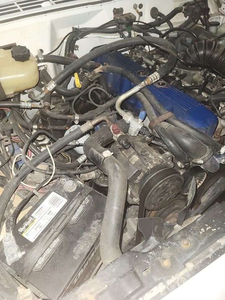 Finally, your AC discharge hose that swings over the valve cover should swing the other way (towards the fender). If your AC is charged, I'd leave it there for now. If not, slightly loosen the fittings and swing the hose over. Looks like you're already converted to R-134a.