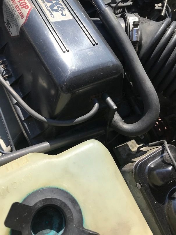 Connections on the back of the air box cover. The small ones are connected to a bimetalic sensor that operates the "preheat" servo at the front of the airbox. The servo diverts the fresh air inlet to the tube connected to the exhaust manifold. In my pic, the one with the 90deg elbow (on the right) comes from the intake manifold. The one on the left goes to the servo. If you don't have or want this working, plug the line coming from the intake manifold.