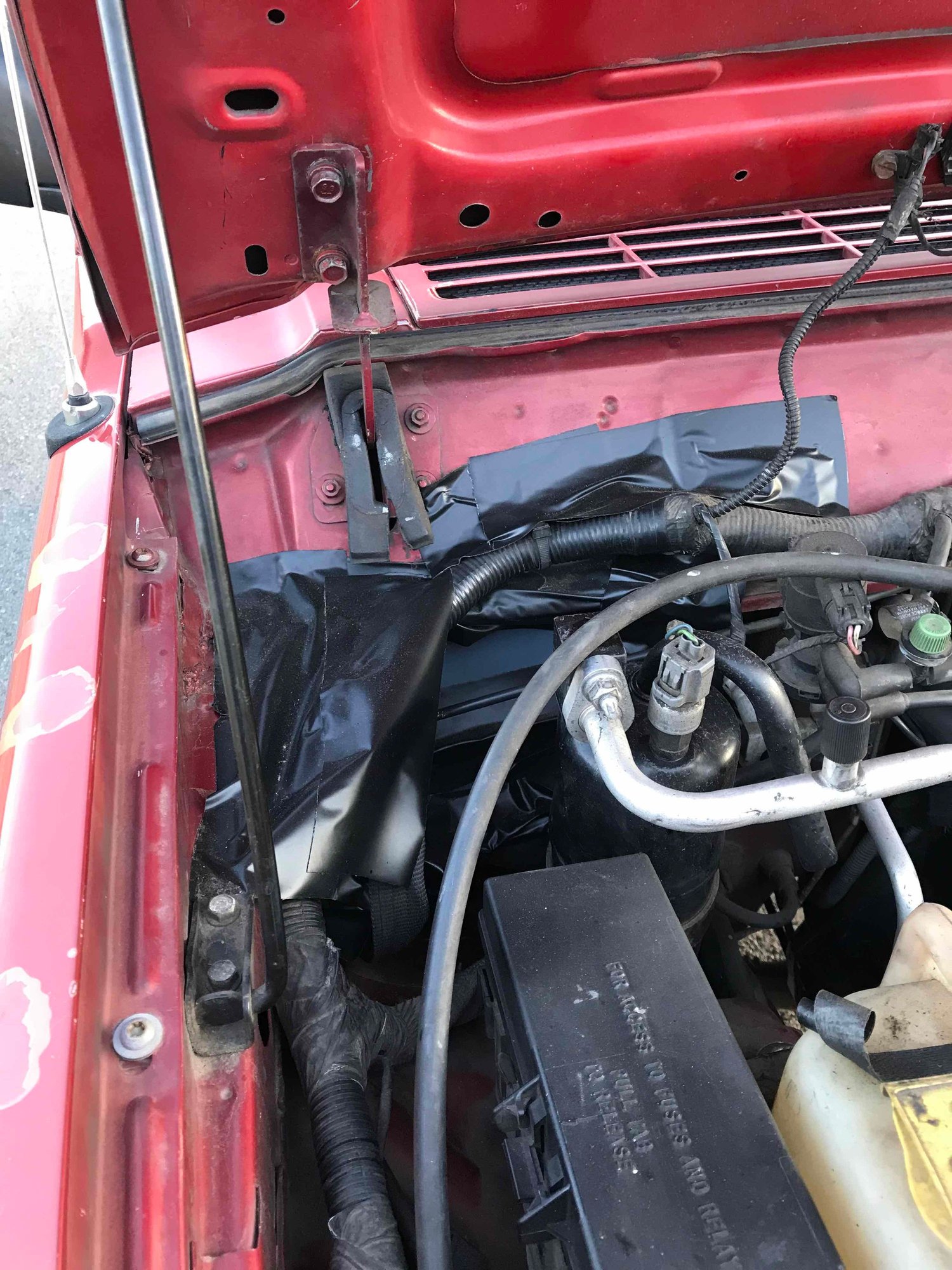 My first attempt did not work. I ended up using some waterproof tape and put several layers to essentially make a shield on top of the engine compartment over the blower motor. It is ugly, but it works. I'll take a pic of what I ended up doing so you can see it in all it's ugly glory. The waterprrof sealing tape I found at HomeDepot has proven to be super useful on other projects.