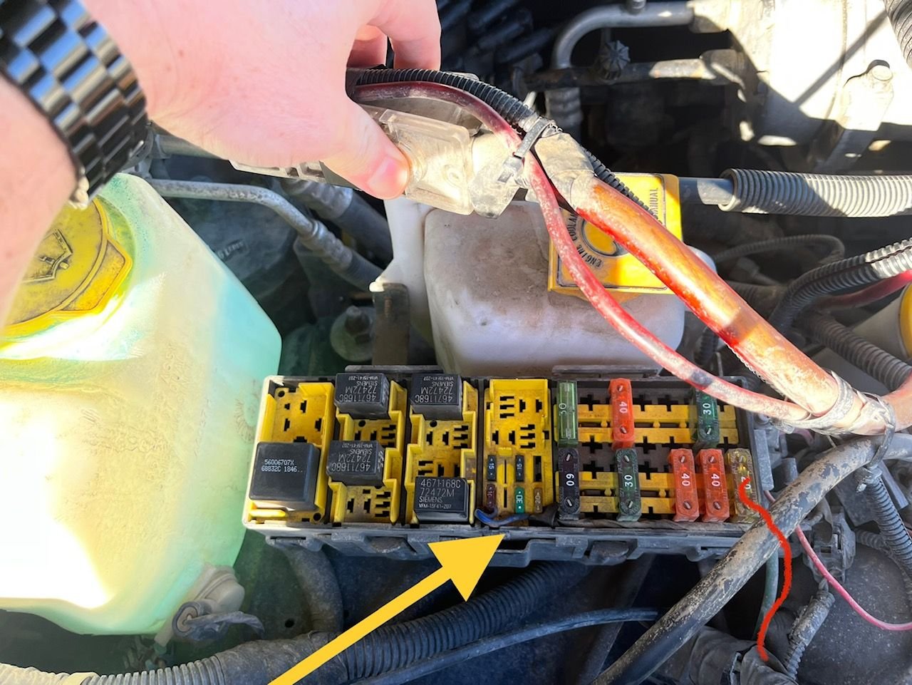 My son's '96 Cherokee Sport just stalled in the middle of the road, and I thought that it was the CPS, but after reading this post I decided to check the fuses under the hood. Turns out the little 30a green fuse was blown (yellow arrow in pic points to it). Since you were spot on with this, I decided to check the rear O2 sensor, and sure enough, the harness was ripped through and one of the wires must have shorted.