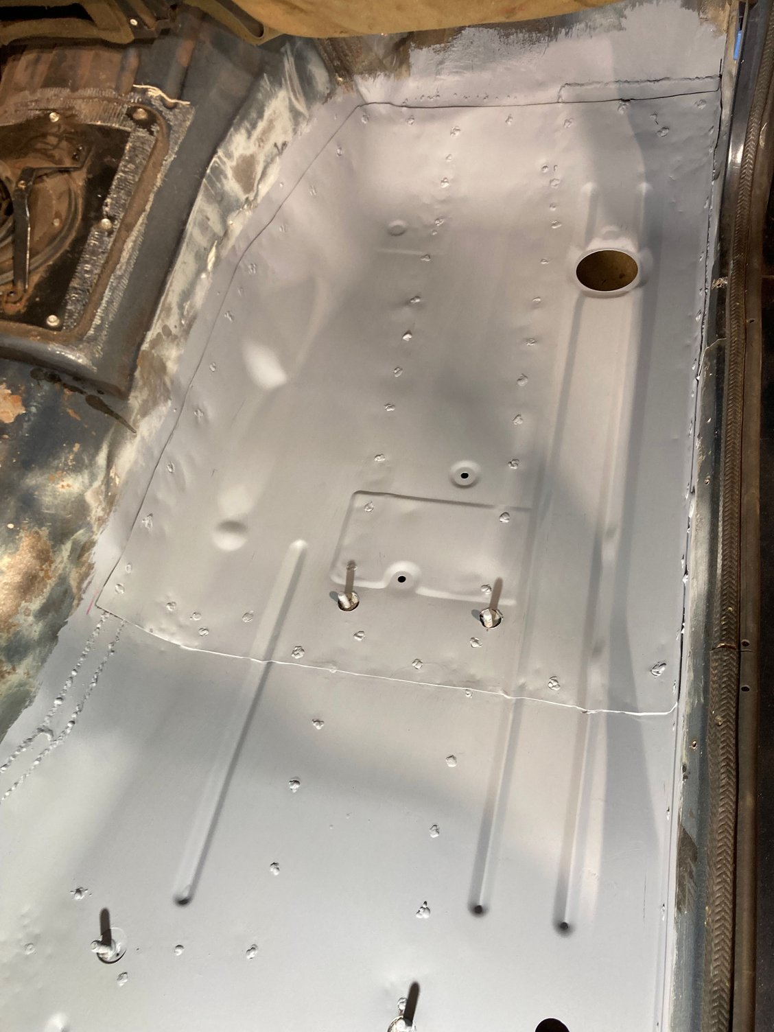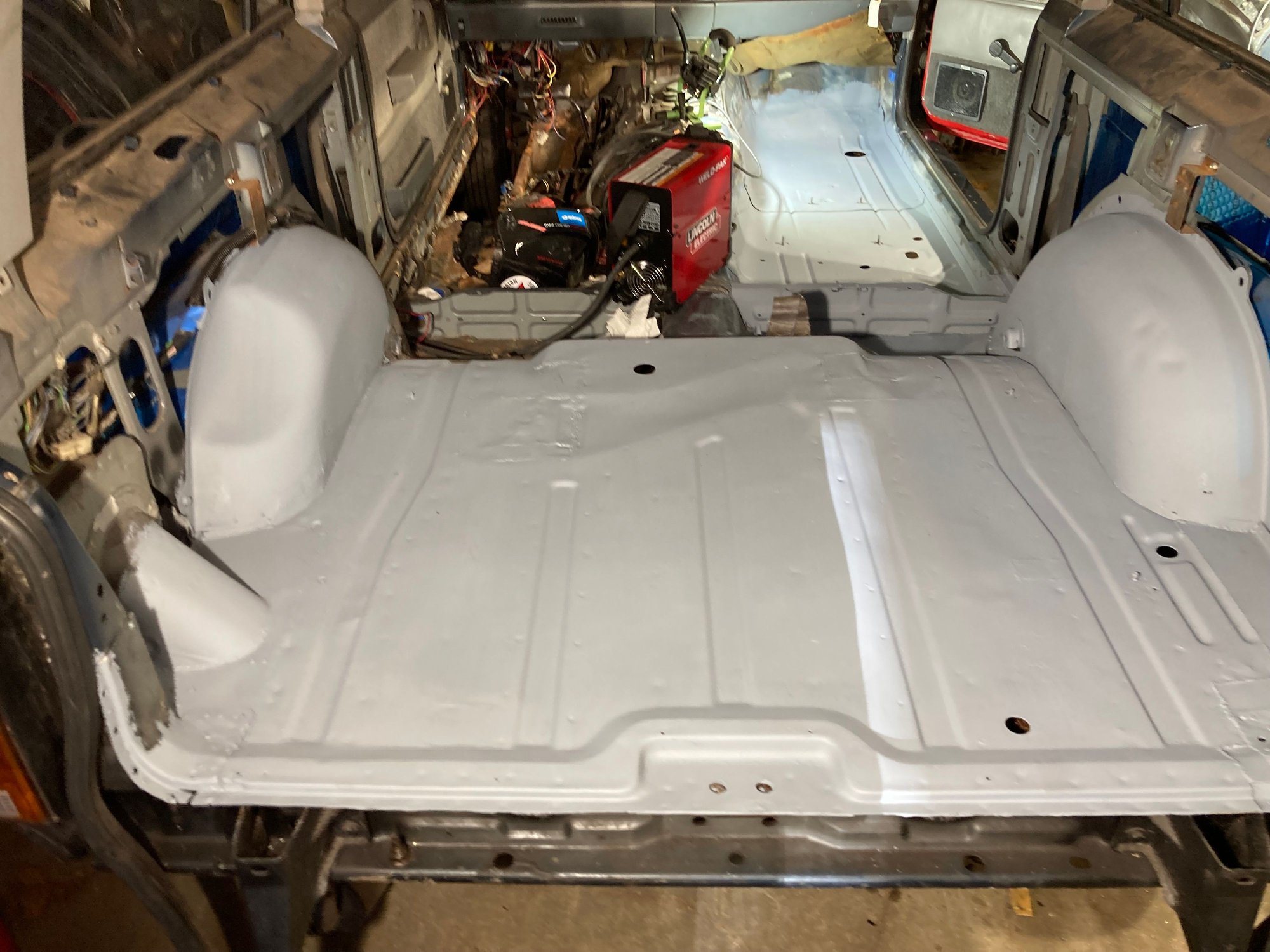 Unibody was perfect. I cleaned it up, painted, and weld-thru primer on the flanges. I also sprayed fluid film inside. I made a piece for behind the rear seat bracket since the C2C fab pan didn't go that far.
