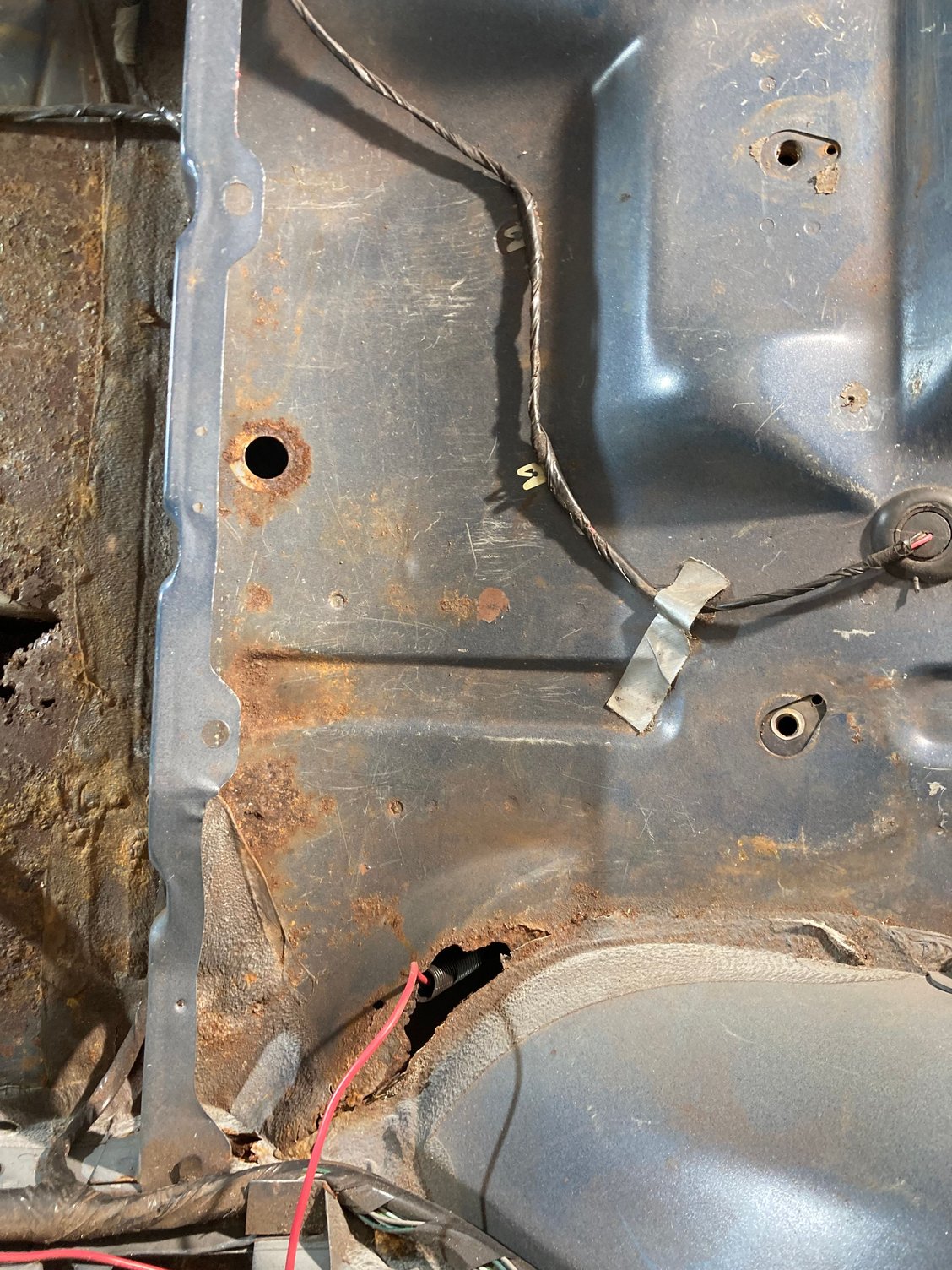 You can see here where the power for the fuel pump is run through a rust hole in the floor. (red wire)