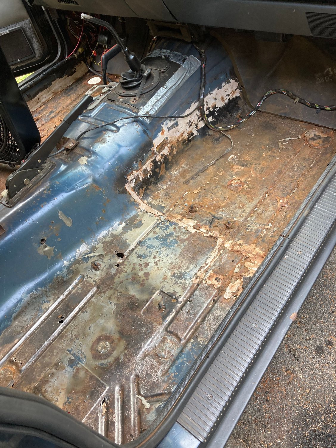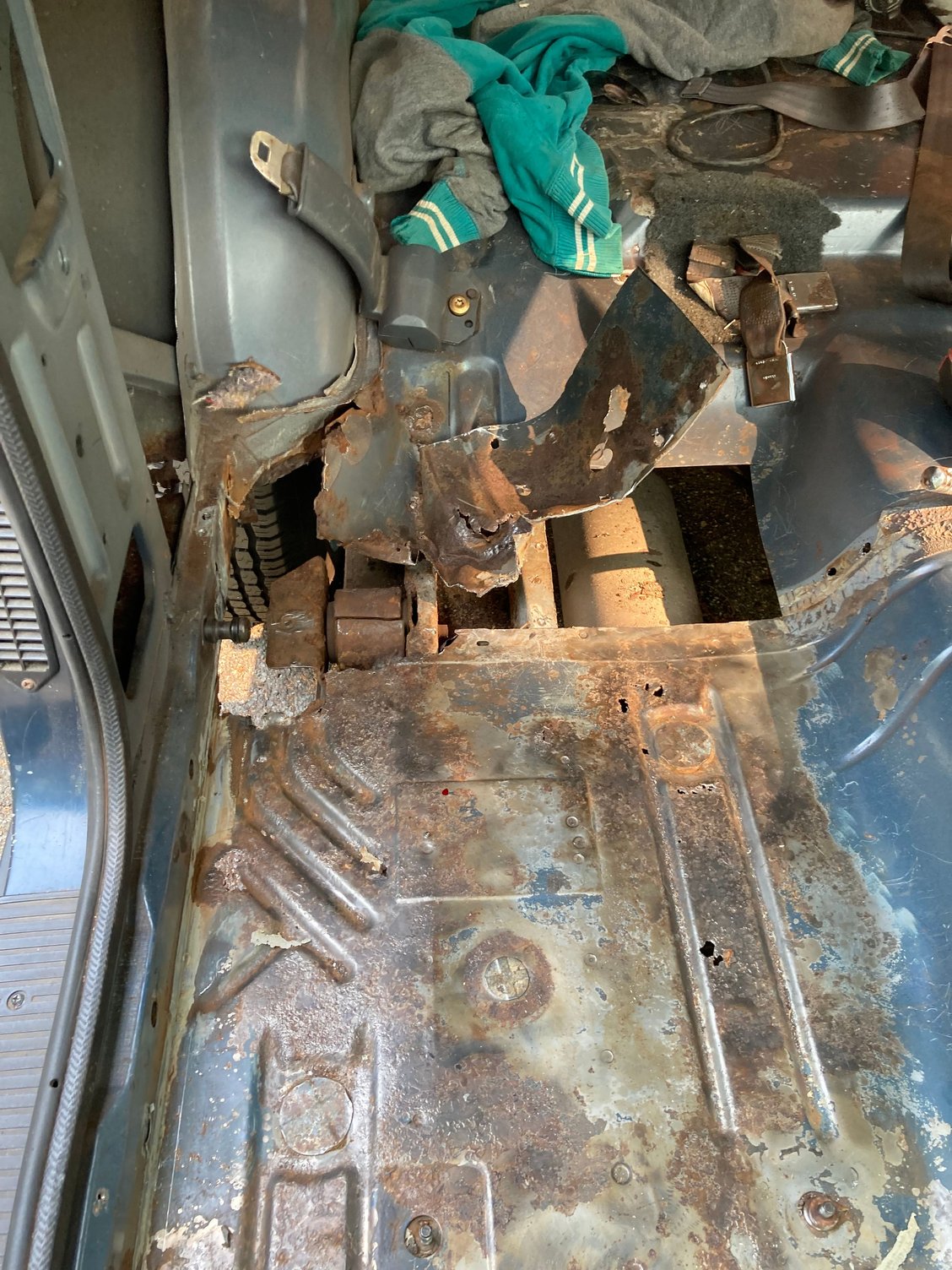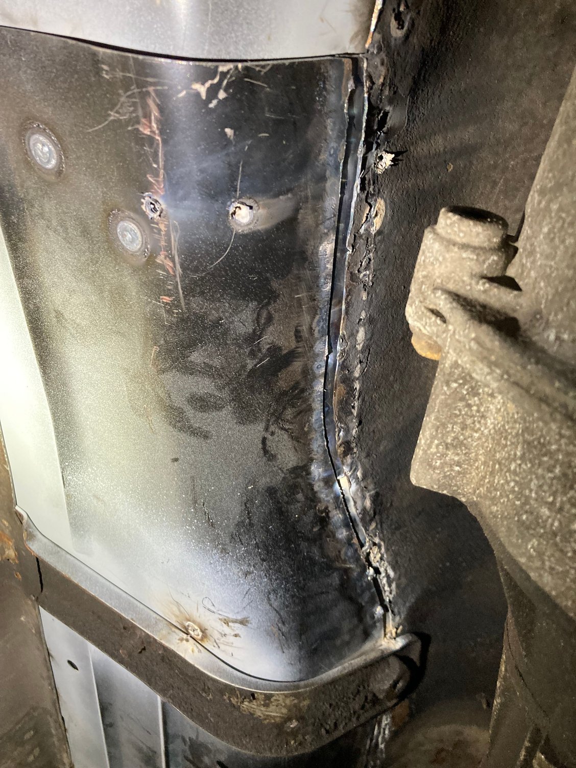 This is what I started with. You can see someone else did a "repair" already. I is just a premade floor pan placed over the old rusting one, booger welded, and bondo for seam sealer.