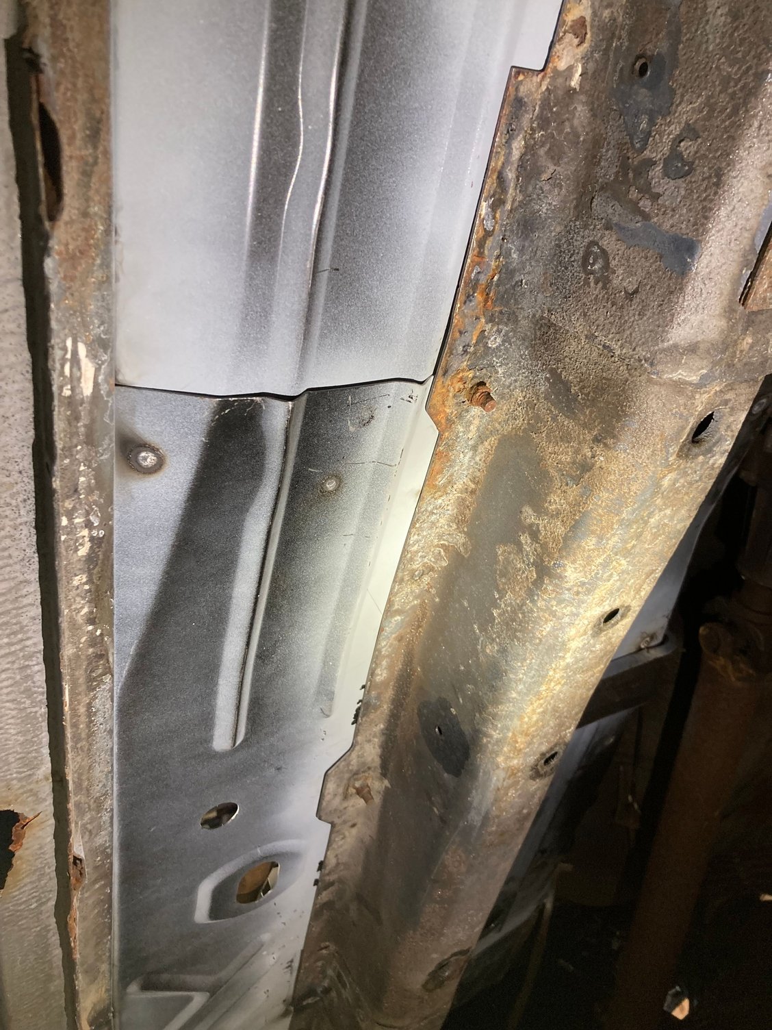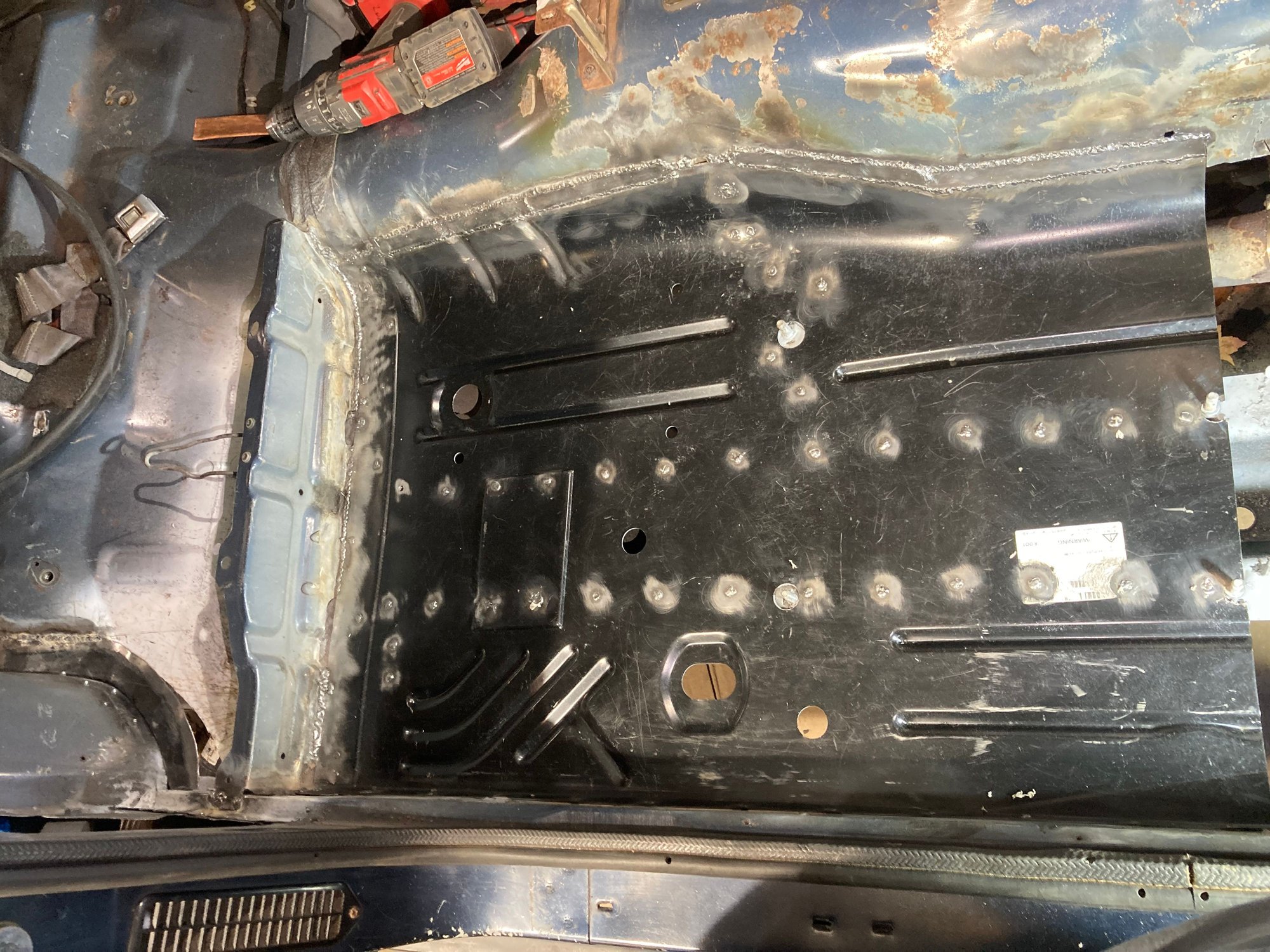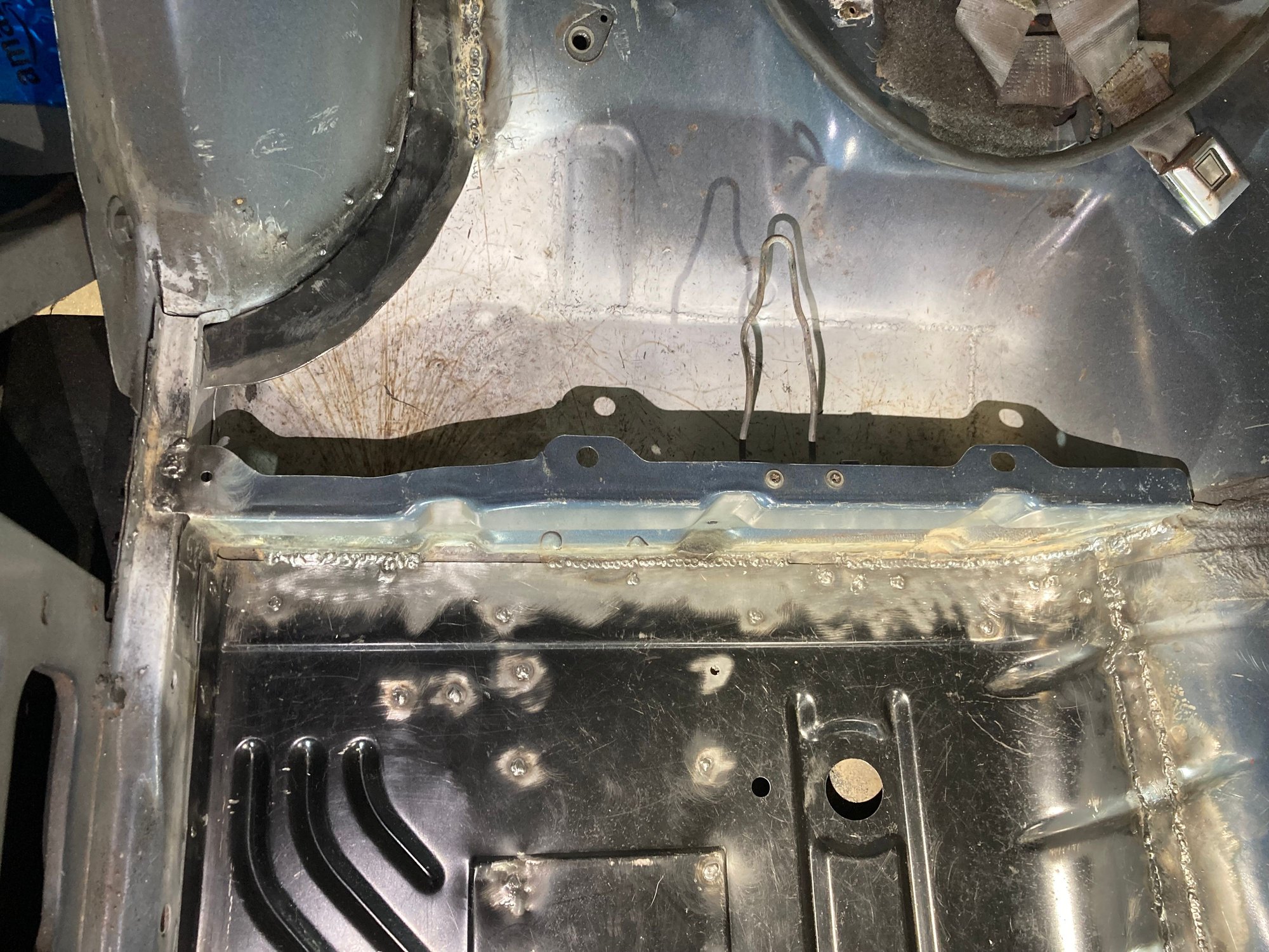 I decided to drill holes and spot weld the areas that overlapped as well as along the unibody, so it was like factory. I wanted to mark and cut the edge along the trans tunnel and do a butt joint, but I made a classic mistake and cut off too much material. 1/4" too short. Ended up welding little plates to fill the gap. I guess I am pretty happy with how it turned out though.