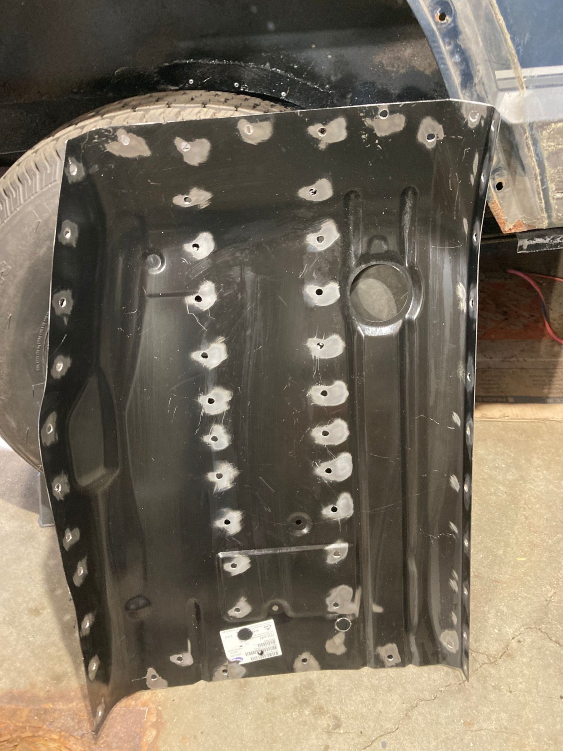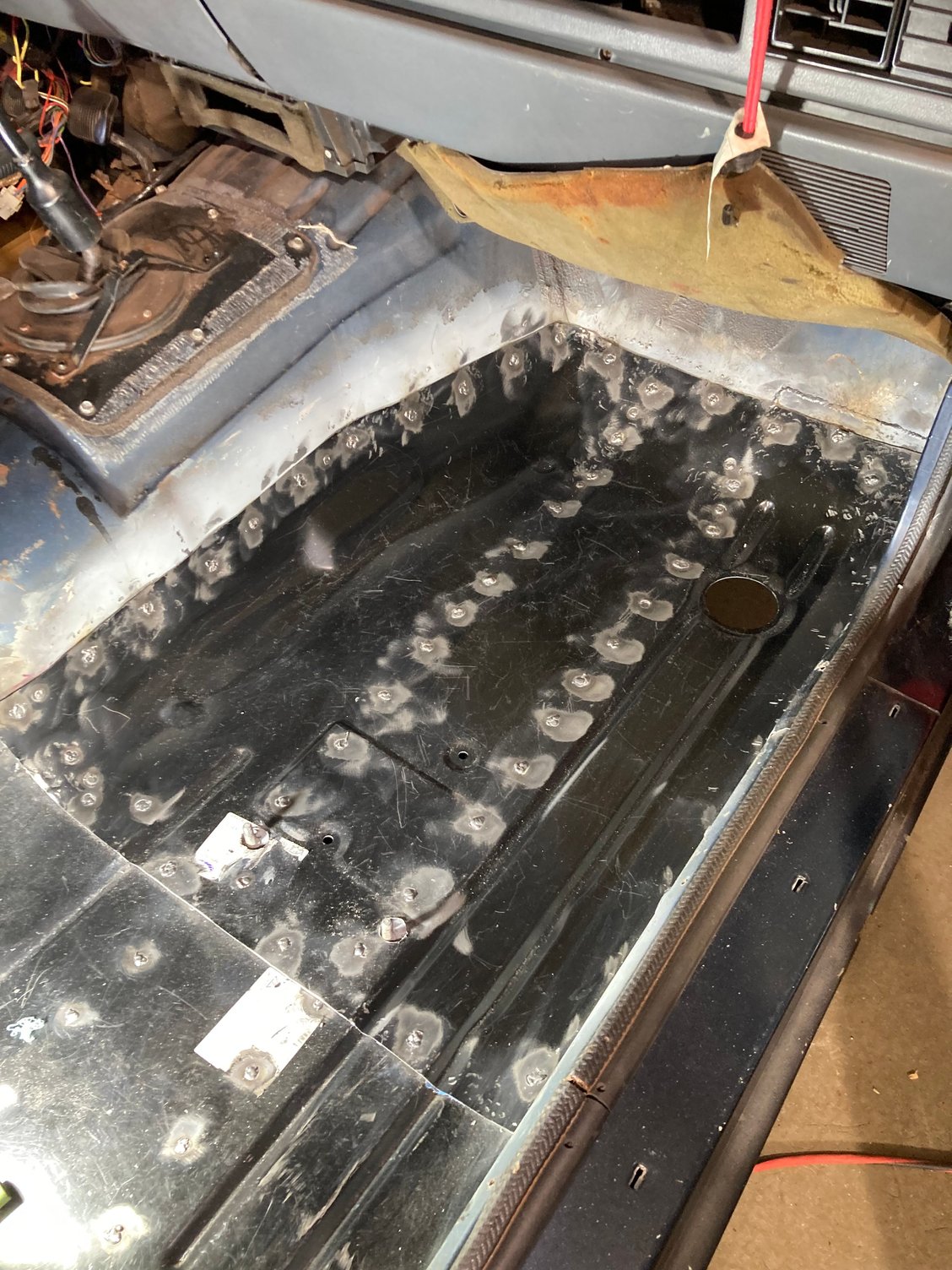 I finished the front passenger floor pan. Decided to go with a different method for this one. I did a lap joints and spot welds. A lot easier to fit, but I think it looks messy and crude.