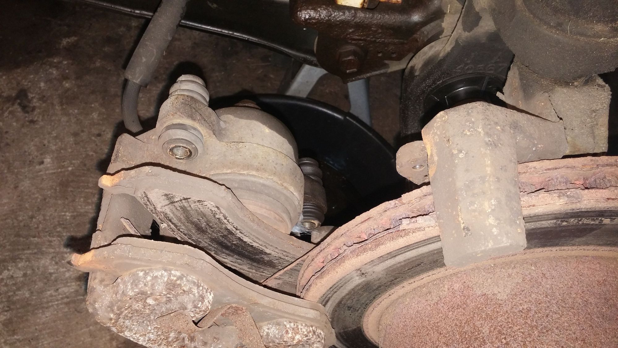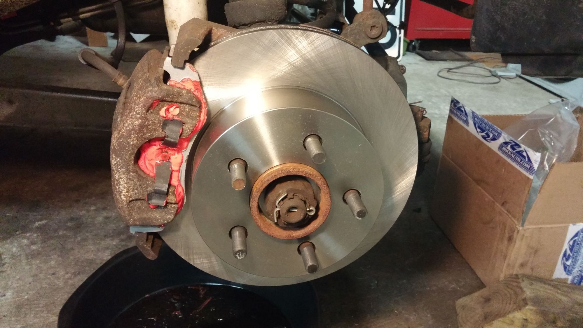 Started working on my brakes this weekend too. I finally got to bleed them since I never did after replacing the hard lines. My neighbor has a vacuum bleeder, easily the best thing I've ever used for brake bleeding. You hook it up to the air compressor, stick the hose on the bleed screen, squeeze the trigger and it pulls vacuum on the line, sucking the air out until its just clean fluid. Easily a one-man job now.