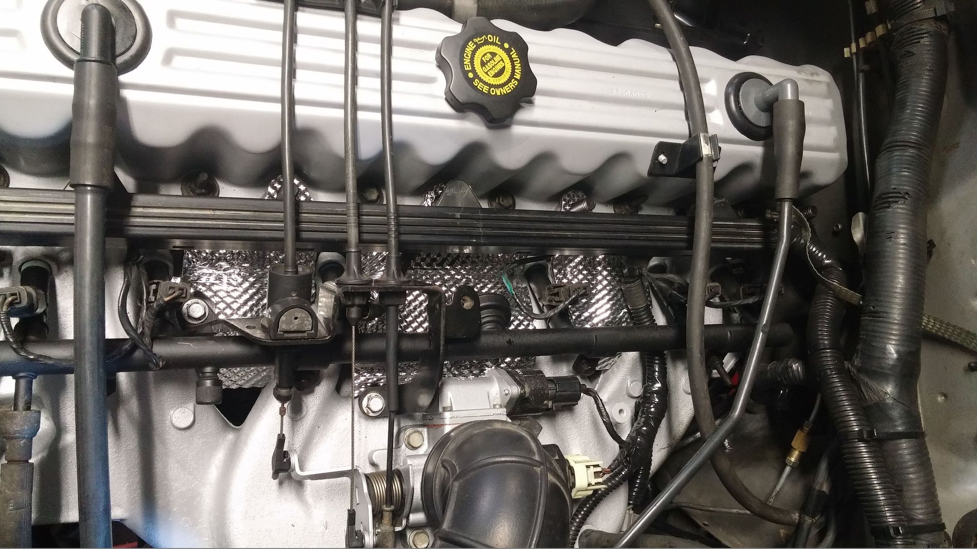 Intake heat shield installed! It was ridiculously simple, no need to remove fuel injectors, rail, etc. You just unbolt the bracket holding the three throttle cables from the intake, unclip the coolant sensor connector and lift the EFI harness off the head studs, remove the front air tube from the valve cover to air box and then slip the heat shield in under the rail. Then re-assemble, took maybe 5 minutes start to finish.